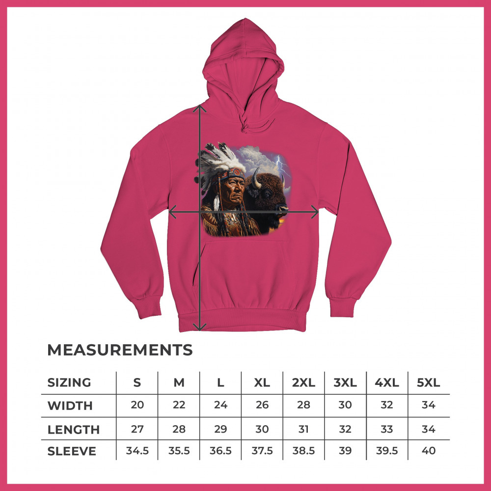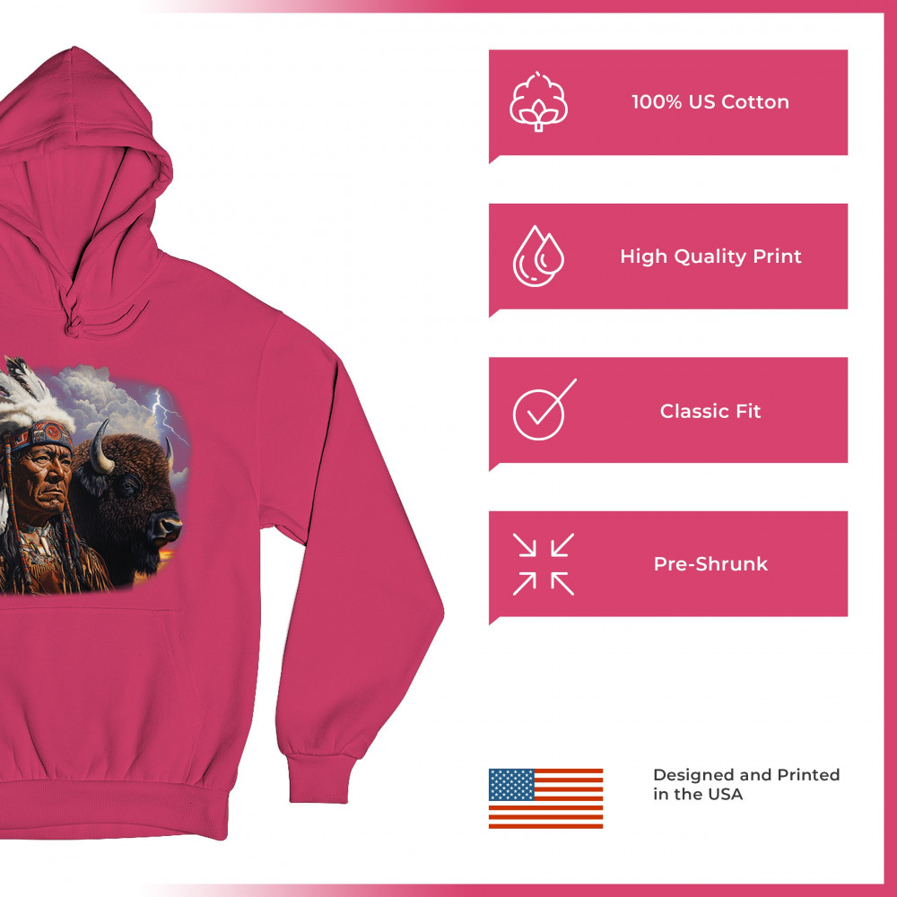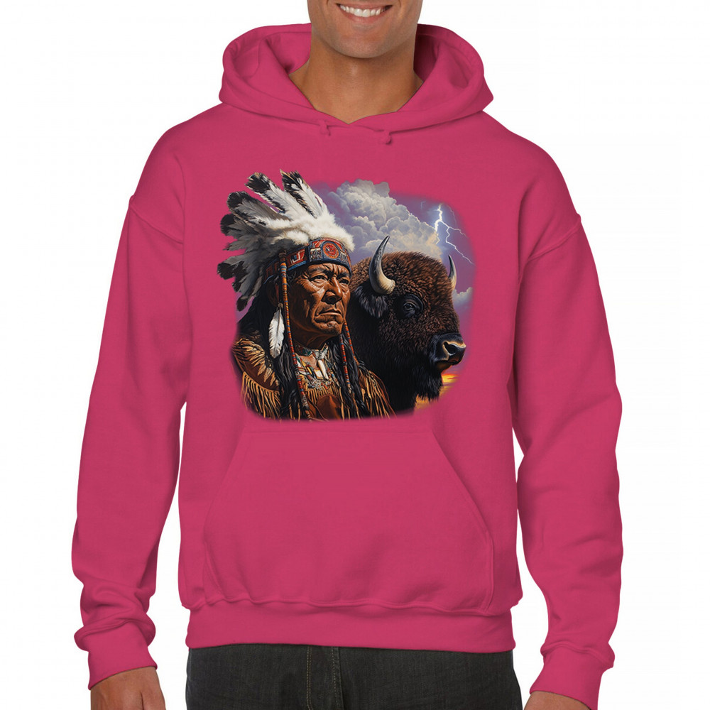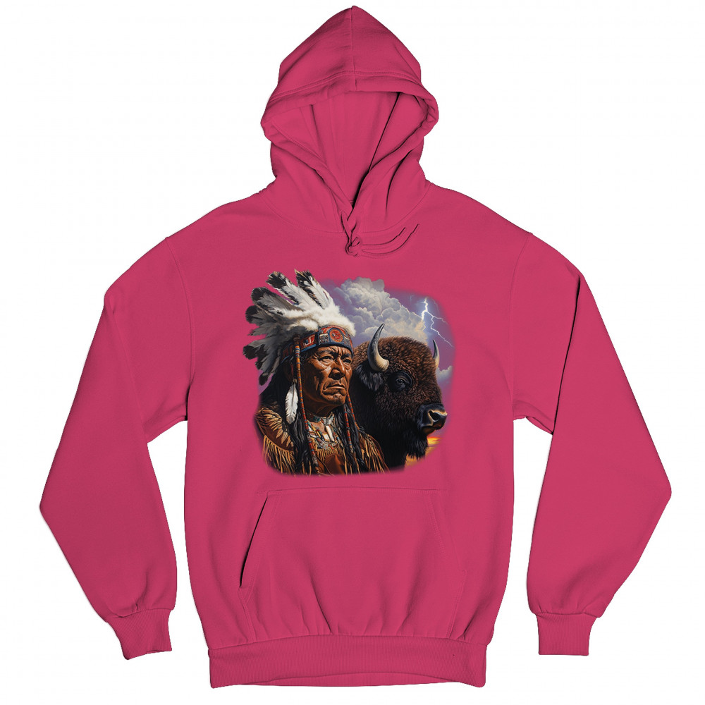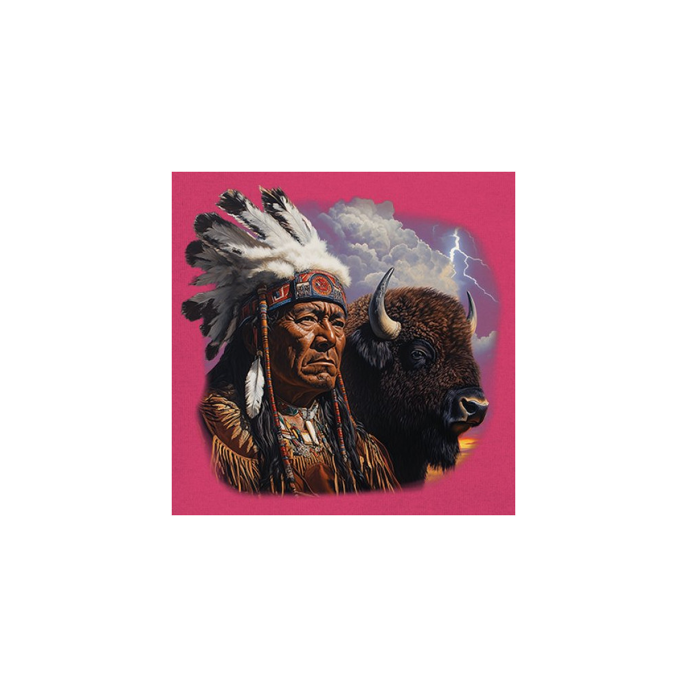 This powerful design features a Native American elder in traditional dress and feathered headdress beside a noble bison. Framed by a stormy sky and lightning, the art symbolizes tribal pride, spiritual harmony, ancestral strength, and a deep connection to nature’s raw energy.