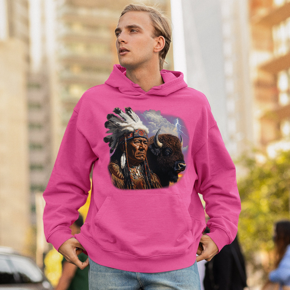 Bold tribal elder and bison design framed by lightning sky—honoring heritage, strength, resilience, and sacred connection to nature.