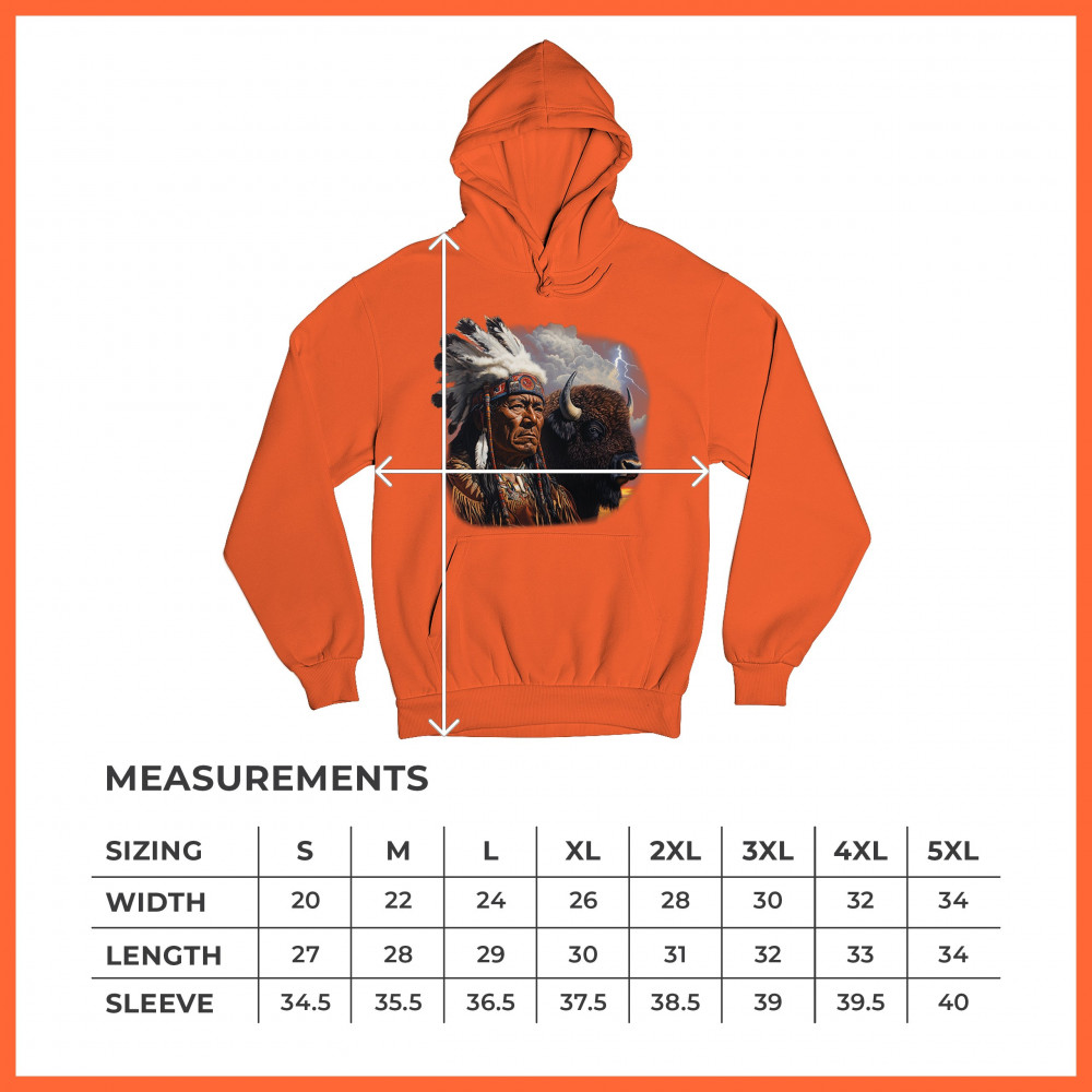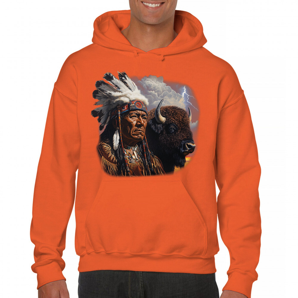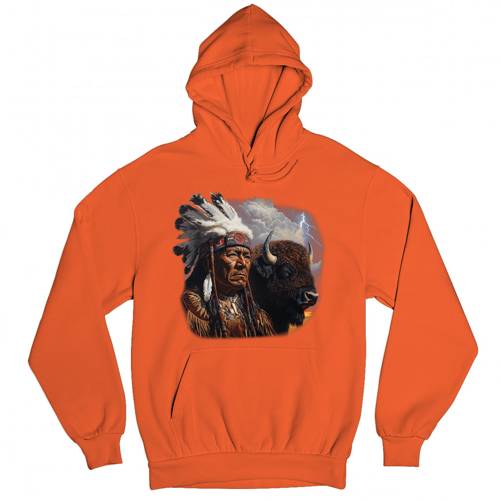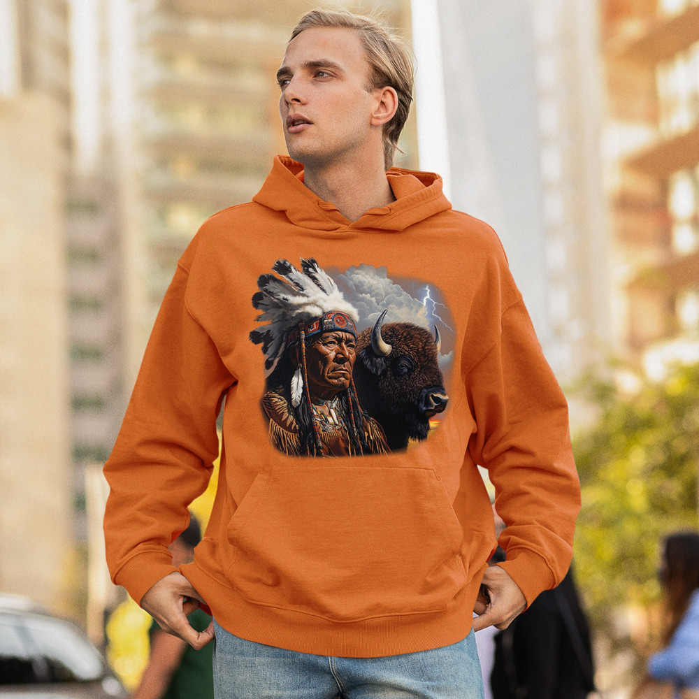 This powerful design features a Native American elder in traditional dress and feathered headdress beside a noble bison. Framed by a stormy sky and lightning, the art symbolizes tribal pride, spiritual harmony, ancestral strength, and a deep connection to nature’s raw energy.