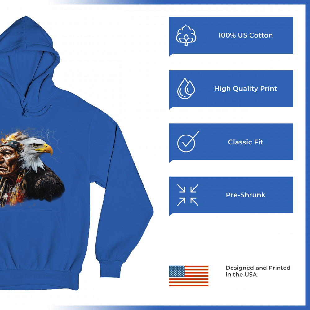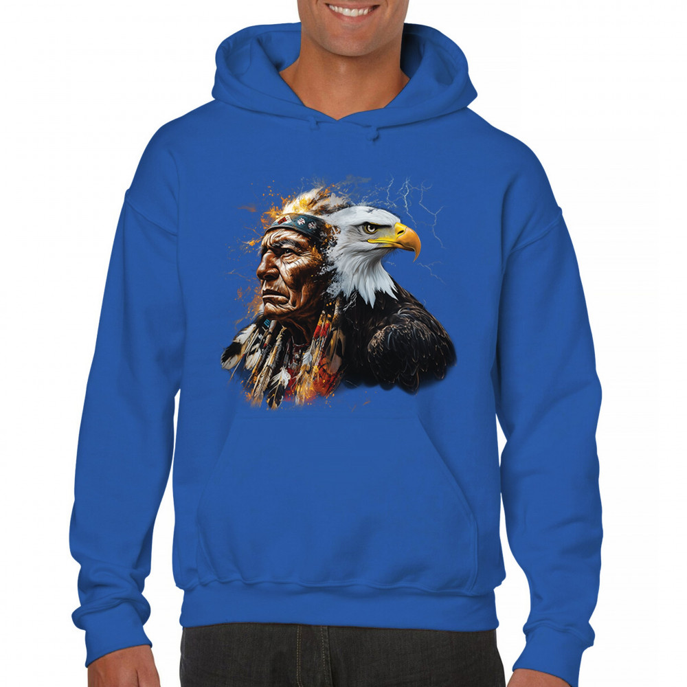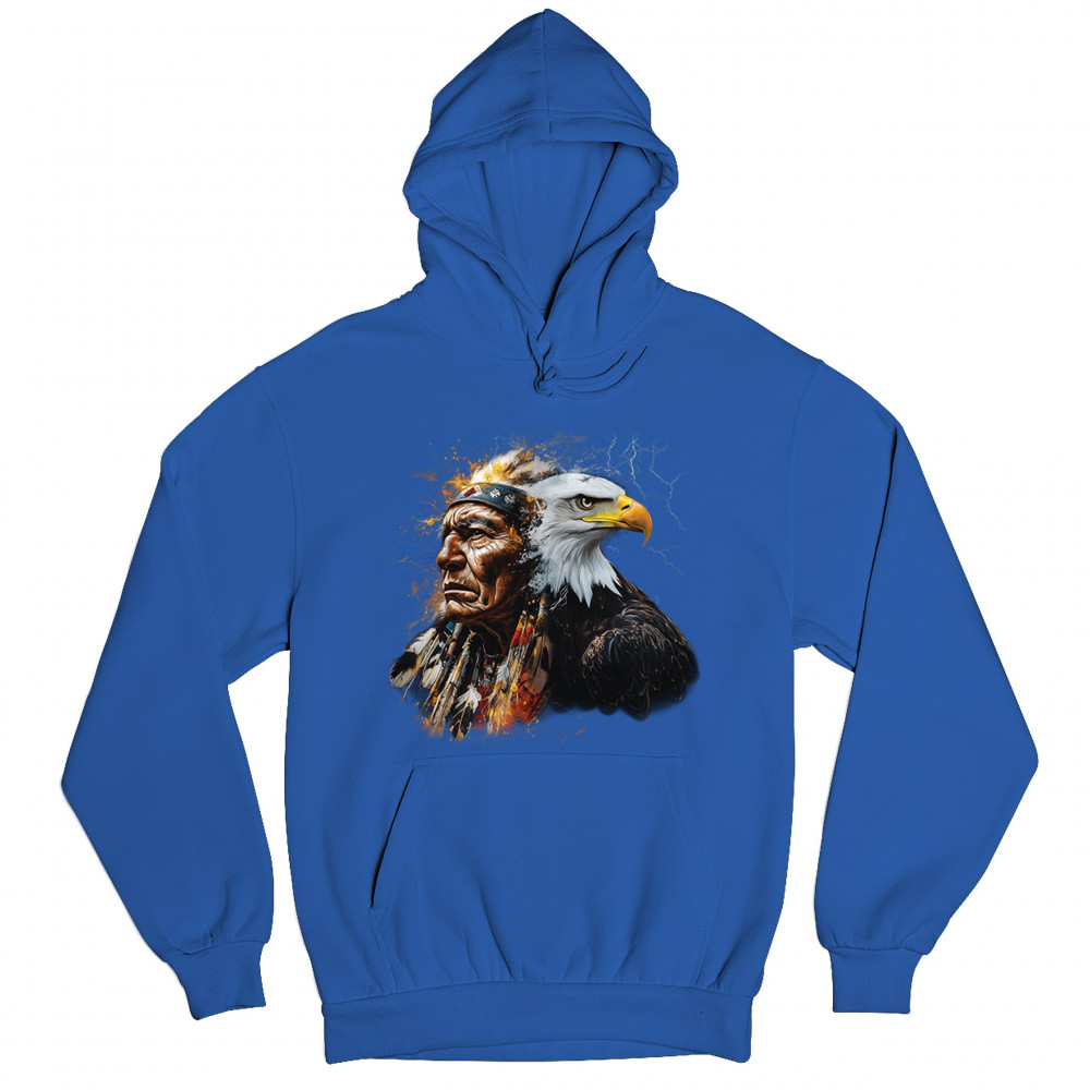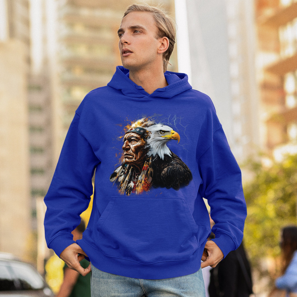 This electrifying design showcases a Native American chief with a bold bald eagle, surrounded by lightning and fire. It blends spiritual animal symbolism with cultural strength and pride. Ideal for admirers of tribal heritage, ancestral energy, and fierce visual storytelling through nature and tradition.