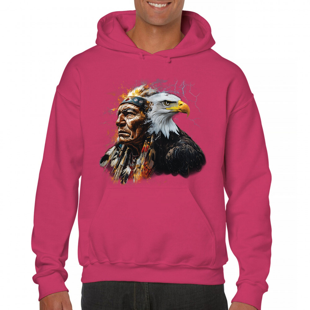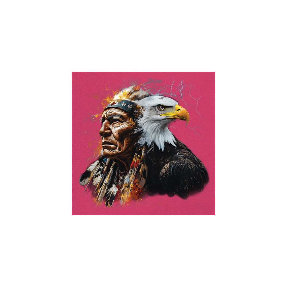 This electrifying design showcases a Native American chief with a bold bald eagle, surrounded by lightning and fire. It blends spiritual animal symbolism with cultural strength and pride. Ideal for admirers of tribal heritage, ancestral energy, and fierce visual storytelling through nature and tradition.