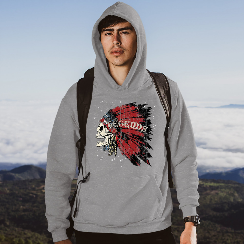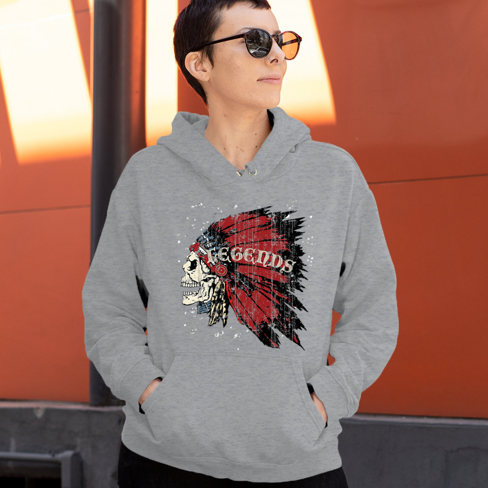 NATIVE AMERICAN LEGENDS sweatshirt skull face war bonnet headdress hoodie gray