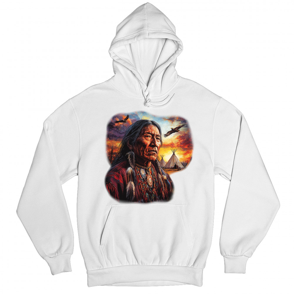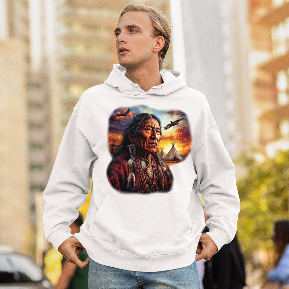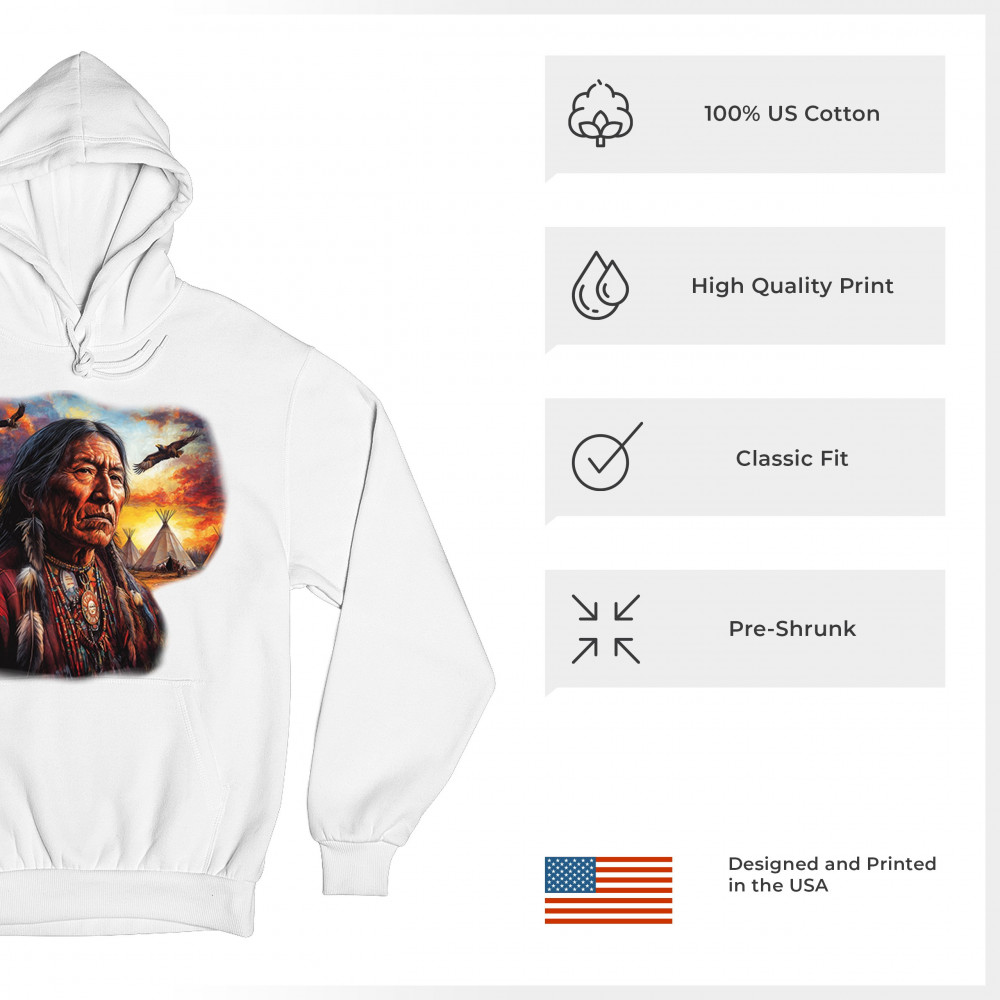 Native elder, teepees, sunset, and eagles come together in this spiritual design celebrating indigenous culture, heritage, and nature’s beauty.