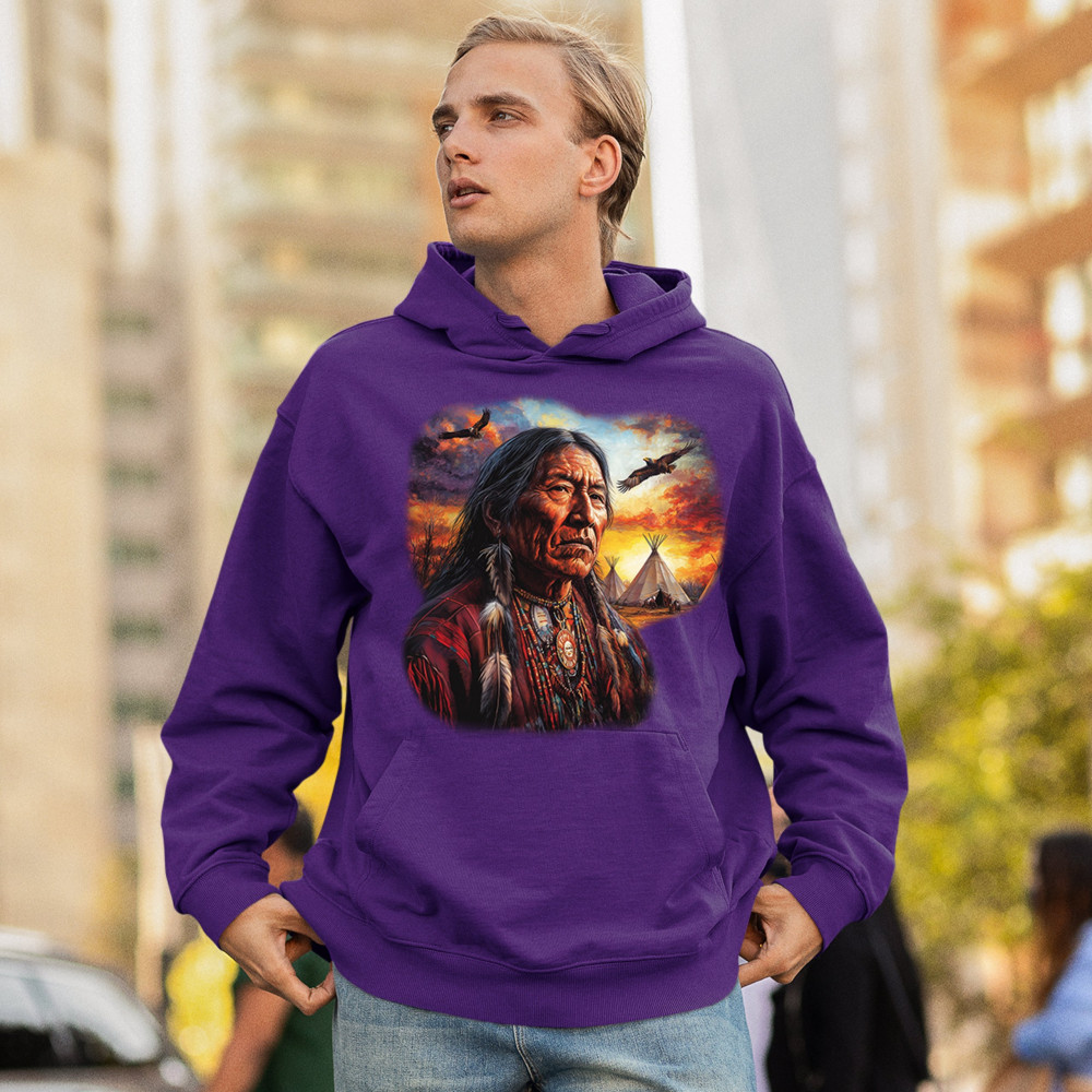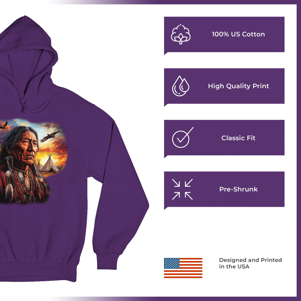 Native elder, teepees, sunset, and eagles come together in this spiritual design celebrating indigenous culture, heritage, and nature’s beauty.