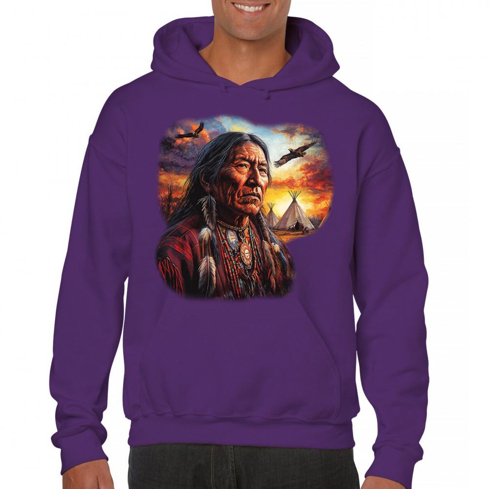 This vivid artwork features a Native American elder in traditional feathered attire, set before a blazing sunset with soaring eagles and peaceful teepees. The scene symbolizes strength, heritage, and spiritual wisdom. A heartfelt tribute to tribal pride, ancestral legacy, and cultural connection to land.