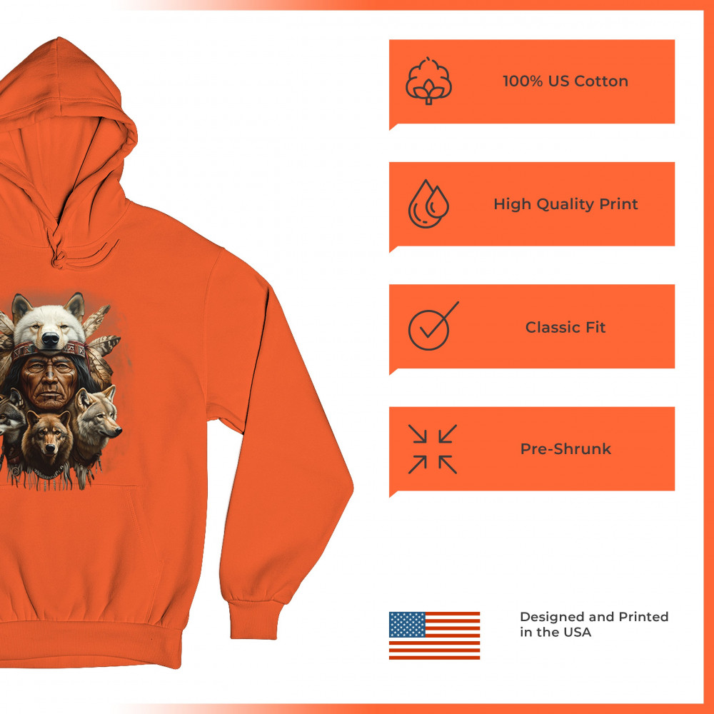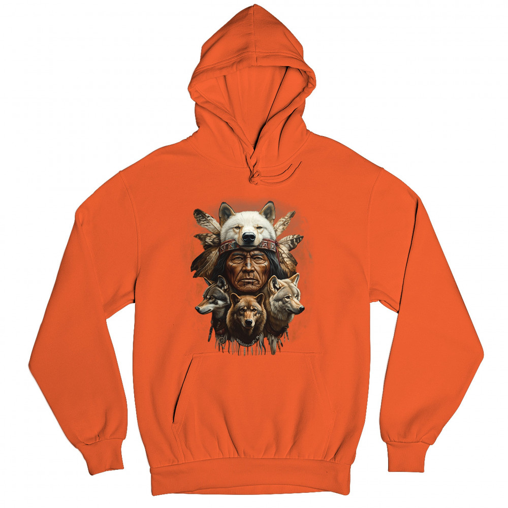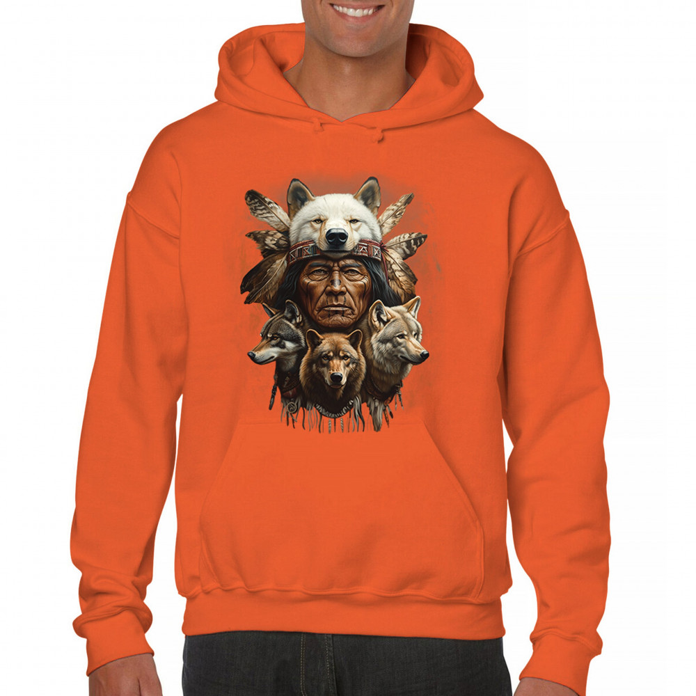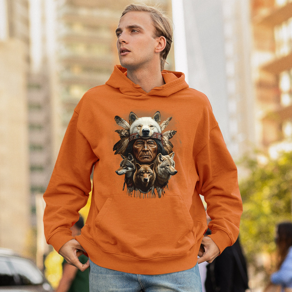 This spiritual tribal design showcases a Native American elder in a detailed wolf headdress surrounded by guardian wolves. It represents strength, loyalty, instinct, and sacred unity with nature. A powerful totem for honoring animal bonds, native pride, and ancestral spiritual guidance through the spirit of the wolf.
