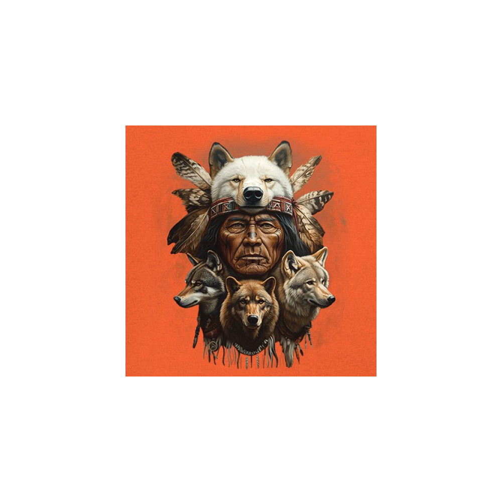 Wolf totem design with Native elder in headdress and guardian wolves. Symbolizes strength, loyalty, spirit animals, and tribal heritage.