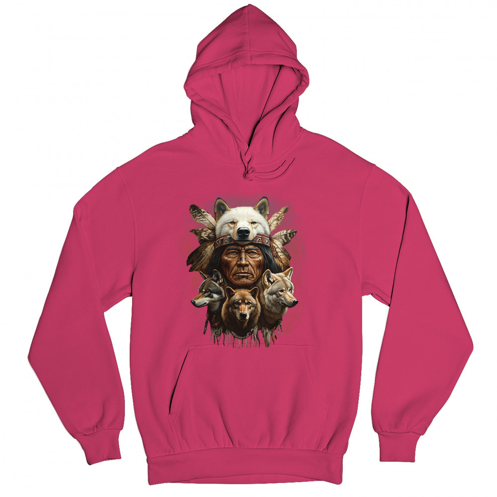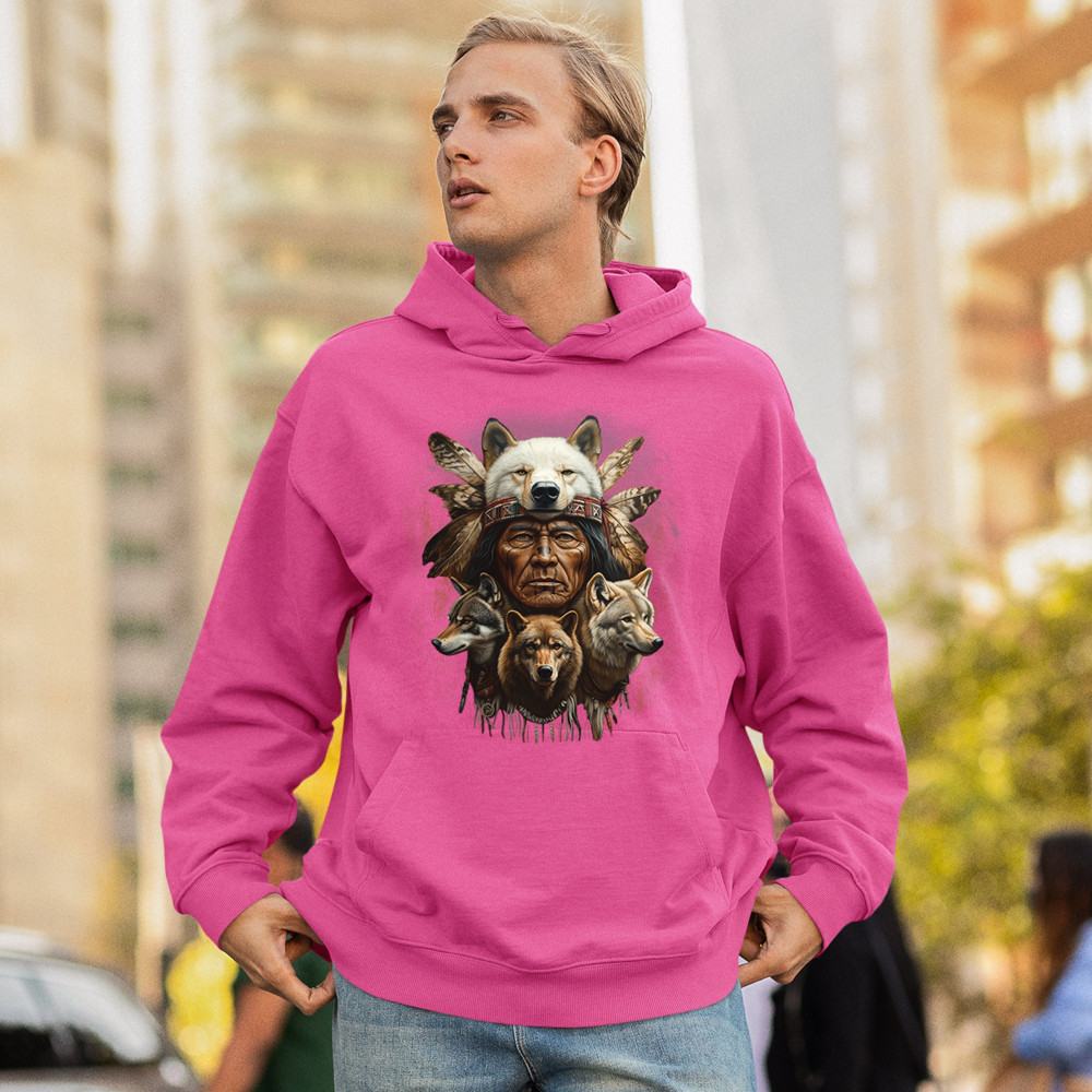 This spiritual tribal design showcases a Native American elder in a detailed wolf headdress surrounded by guardian wolves. It represents strength, loyalty, instinct, and sacred unity with nature. A powerful totem for honoring animal bonds, native pride, and ancestral spiritual guidance through the spirit of the wolf.
