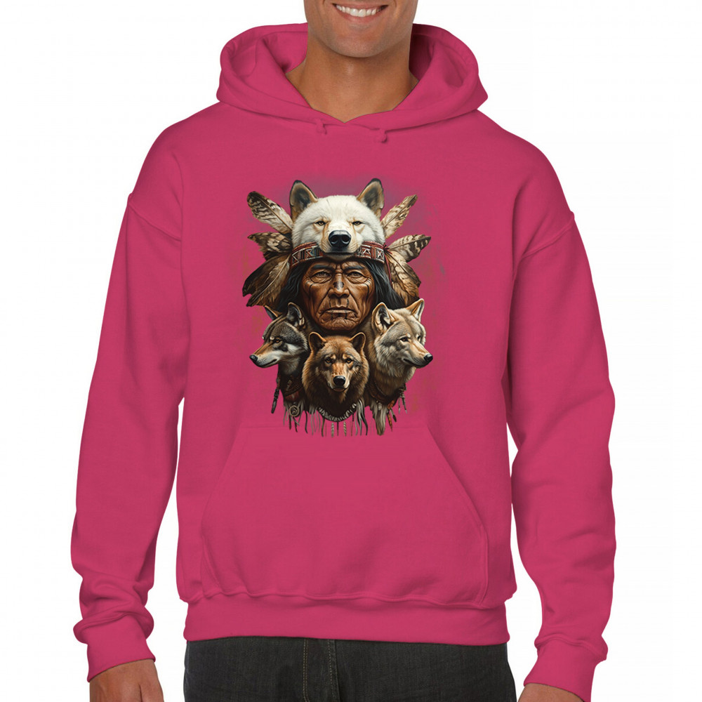 Wolf totem design with Native elder in headdress and guardian wolves. Symbolizes strength, loyalty, spirit animals, and tribal heritage.