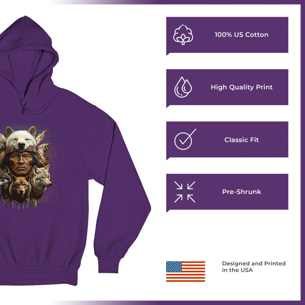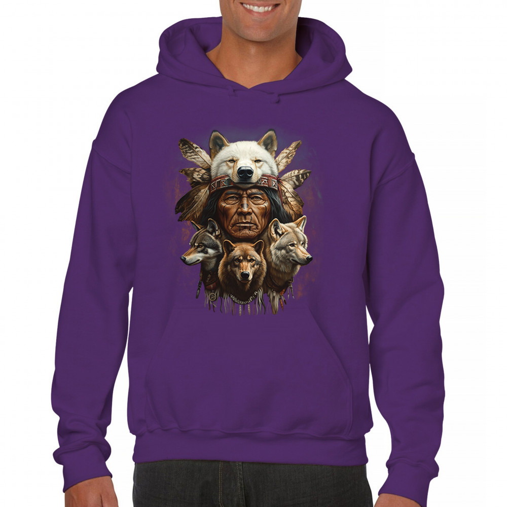 Wolf totem design with Native elder in headdress and guardian wolves. Symbolizes strength, loyalty, spirit animals, and tribal heritage.