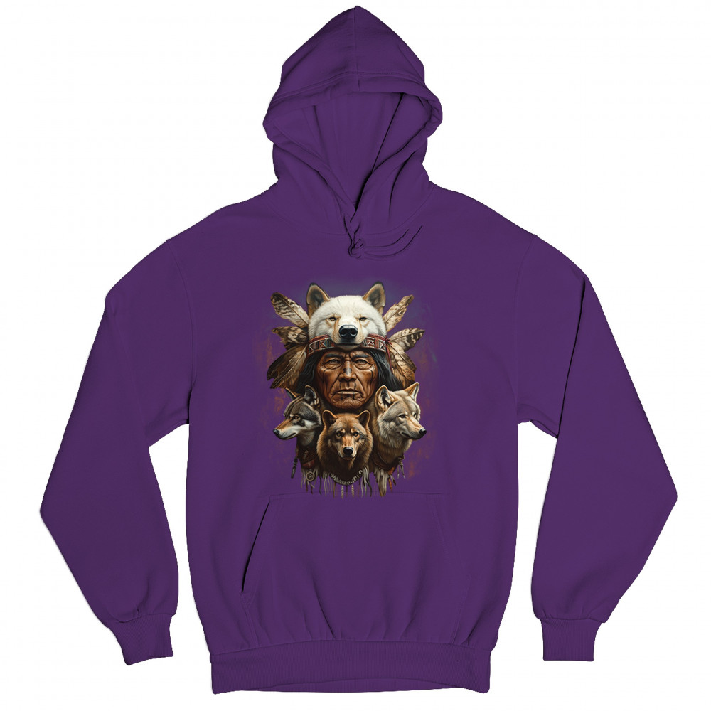 This spiritual tribal design showcases a Native American elder in a detailed wolf headdress surrounded by guardian wolves. It represents strength, loyalty, instinct, and sacred unity with nature. A powerful totem for honoring animal bonds, native pride, and ancestral spiritual guidance through the spirit of the wolf.