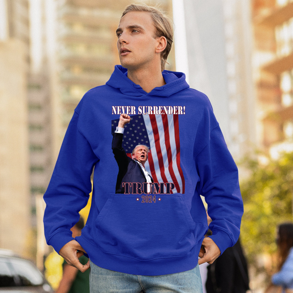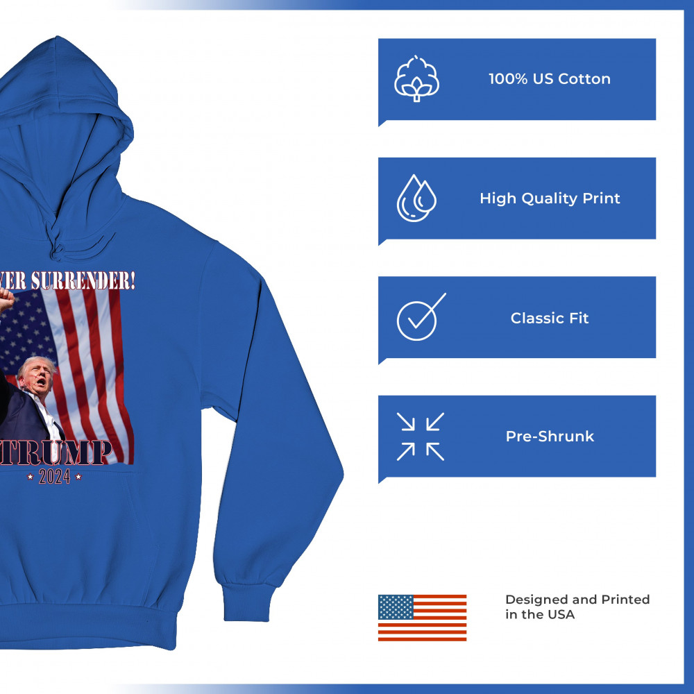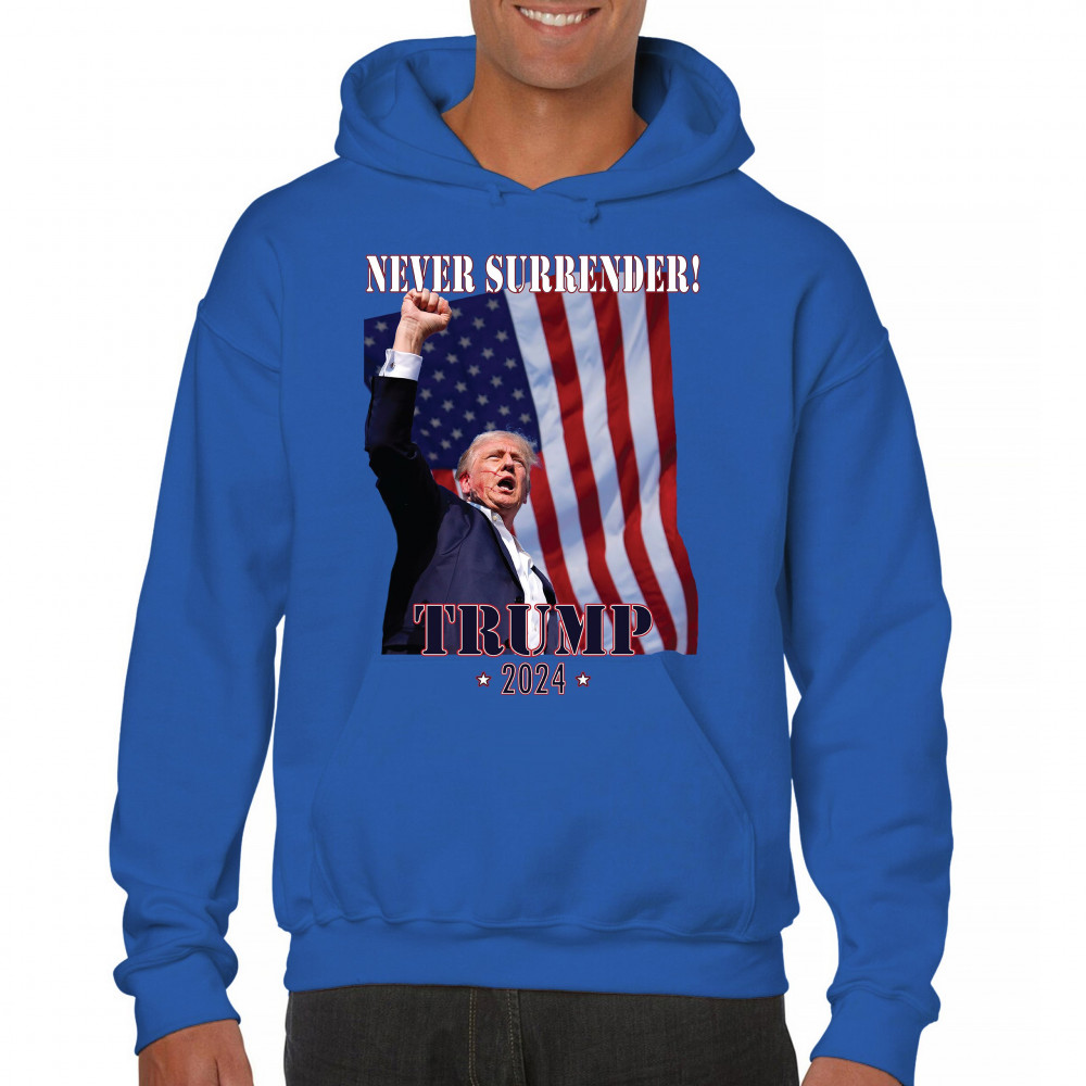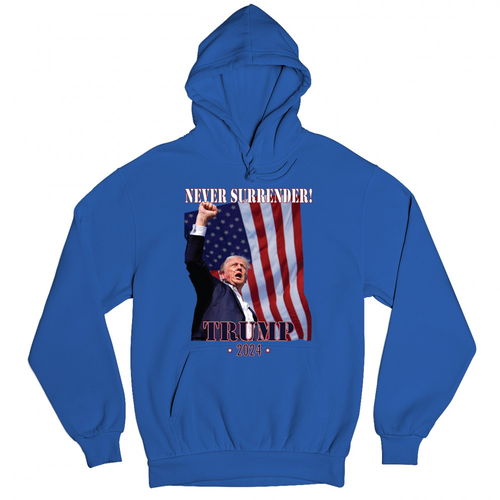 Celebrate your patriotic spirit and political stance with our "Never Surrender! Trump 2024" design. This powerful graphic showcases Donald Trump with a raised fist against the backdrop of the American flag, symbolizing resilience and determination. Ideal for rallies, events, and everyday wear, this design is crafted from premium materials for comfort and durability. Stand out and show your support for America's future with this striking and bold statement piece, perfect for any proud Trump supporter.