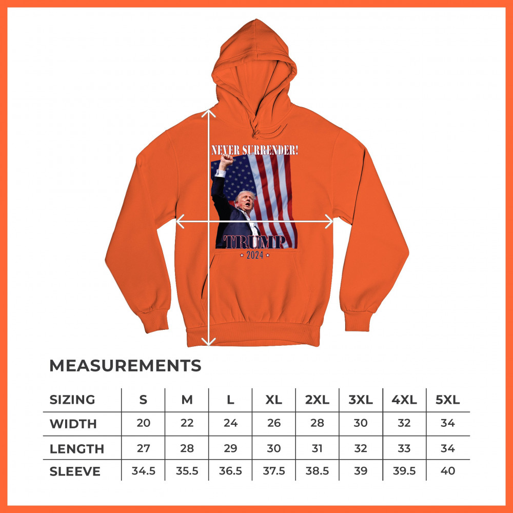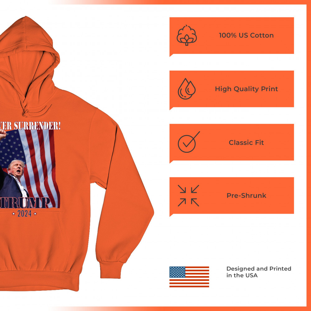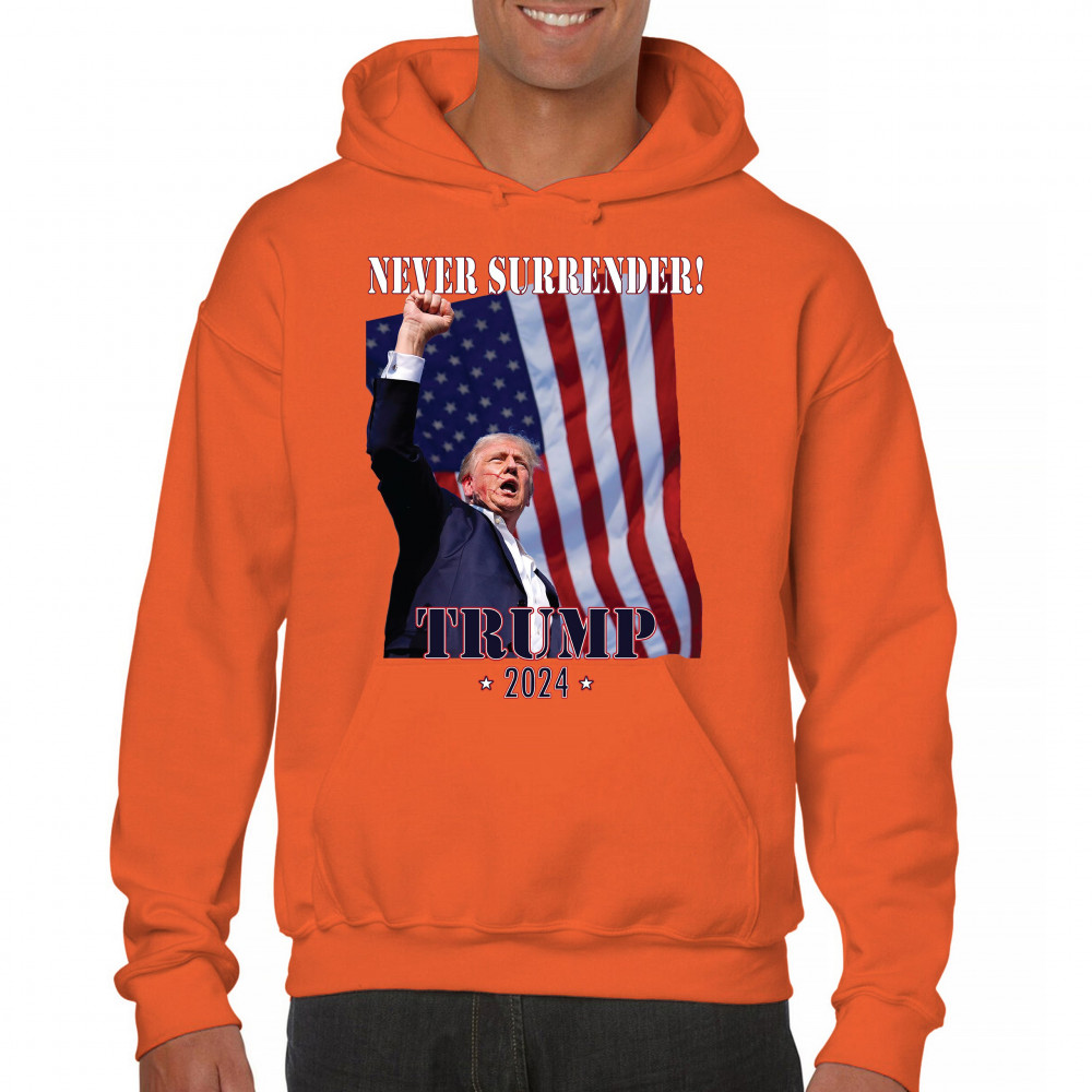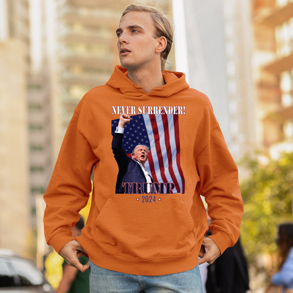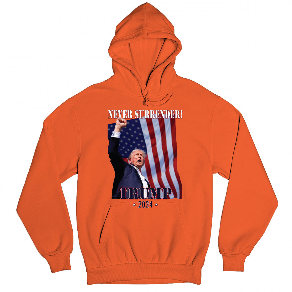 NEVER SURRENDER TRUMP 2024 sweatshirt president maga rally america fjb hoodie orange