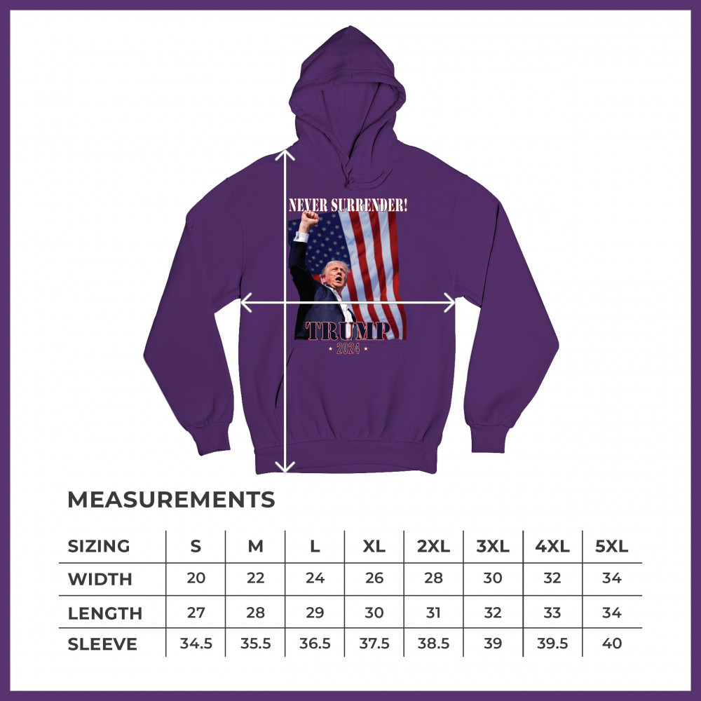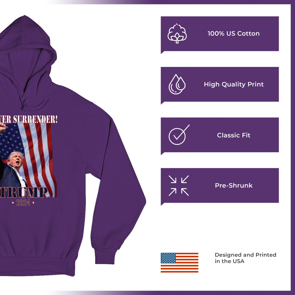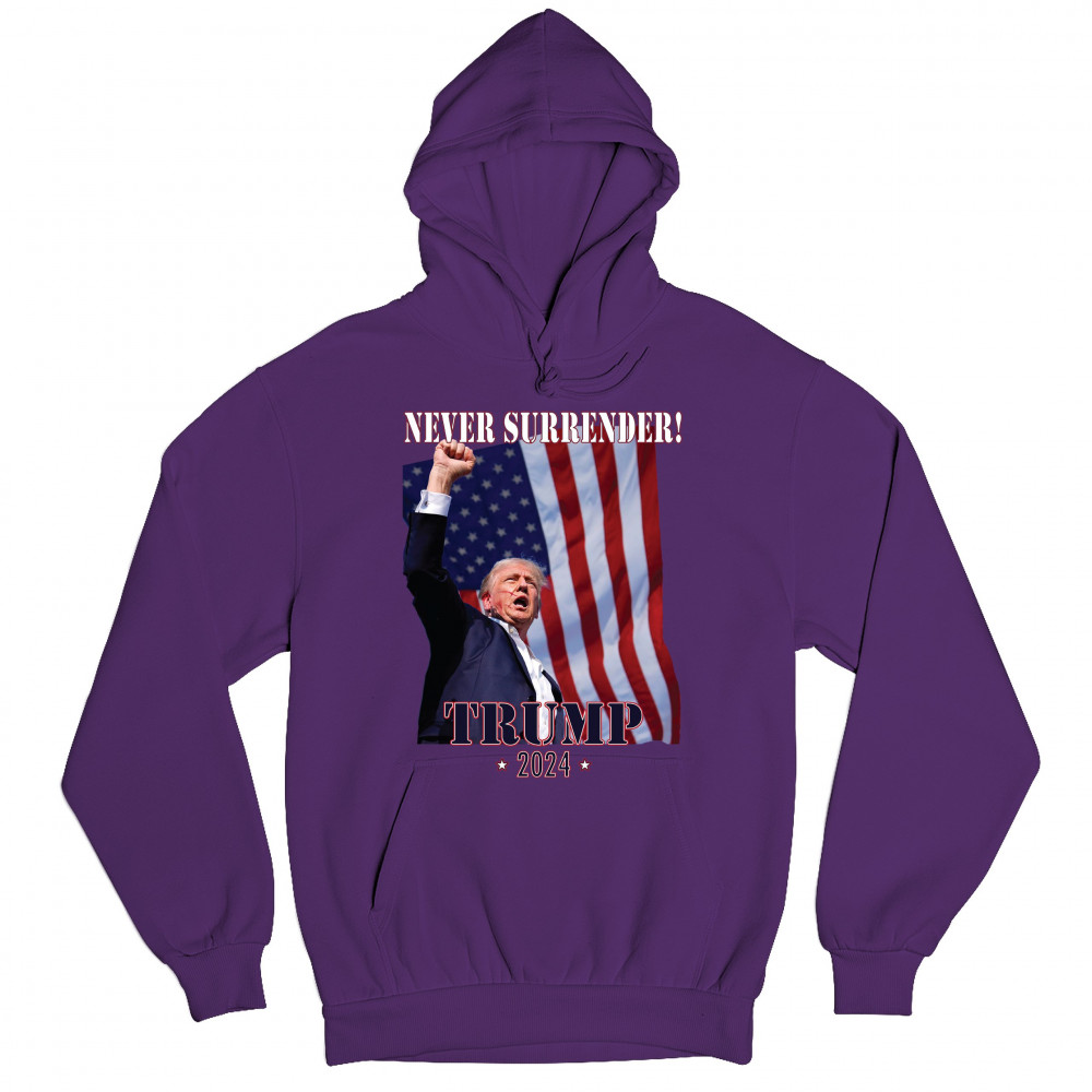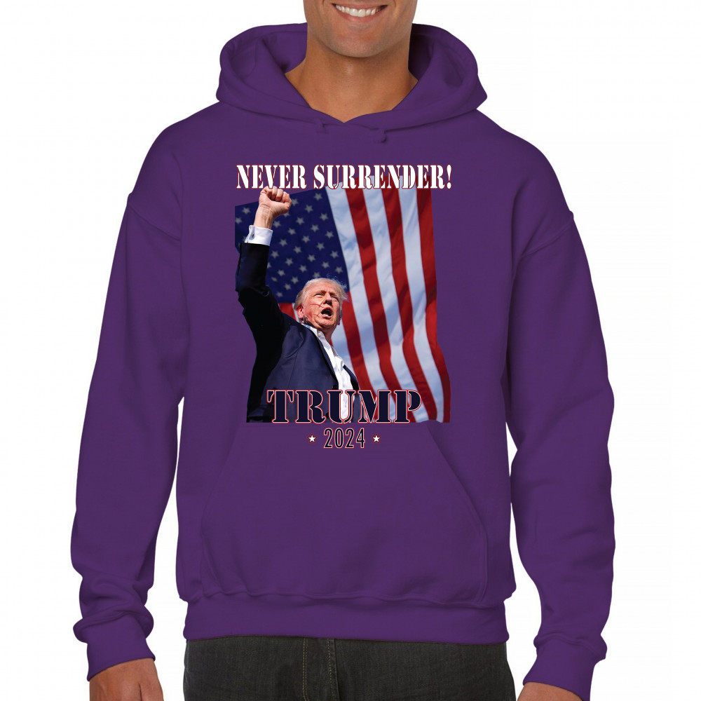 Celebrate your patriotic spirit and political stance with our "Never Surrender! Trump 2024" design. This powerful graphic showcases Donald Trump with a raised fist against the backdrop of the American flag, symbolizing resilience and determination. Ideal for rallies, events, and everyday wear, this design is crafted from premium materials for comfort and durability. Stand out and show your support for America's future with this striking and bold statement piece, perfect for any proud Trump supporter.
