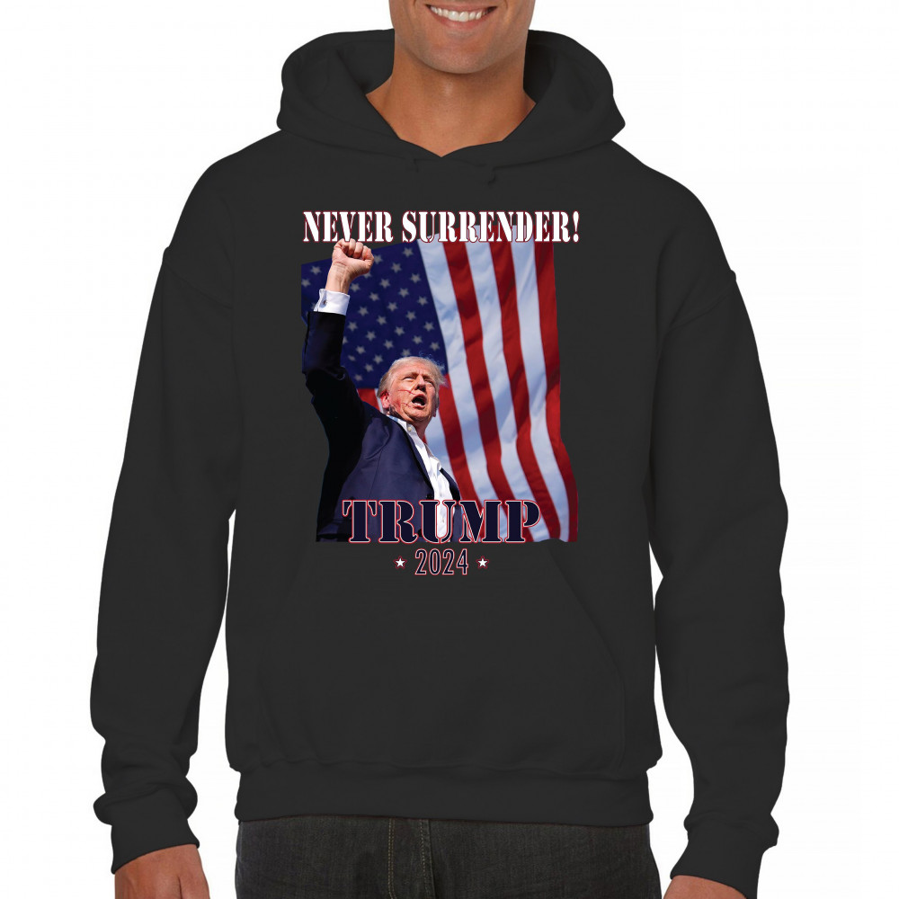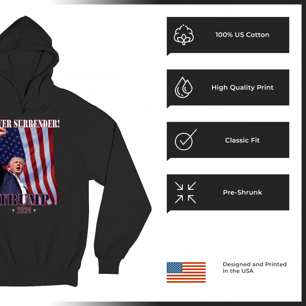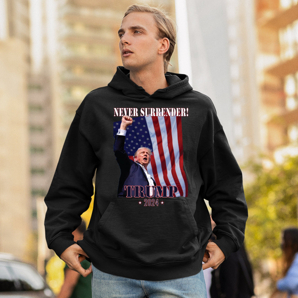 Support Donald Trump with our bold "Never Surrender! Trump 2024" design, featuring Trump against the American flag. Perfect for rallies and everyday wear.