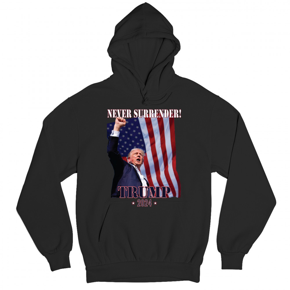 Celebrate your patriotic spirit and political stance with our "Never Surrender! Trump 2024" design. This powerful graphic showcases Donald Trump with a raised fist against the backdrop of the American flag, symbolizing resilience and determination. Ideal for rallies, events, and everyday wear, this design is crafted from premium materials for comfort and durability. Stand out and show your support for America's future with this striking and bold statement piece, perfect for any proud Trump supporter.