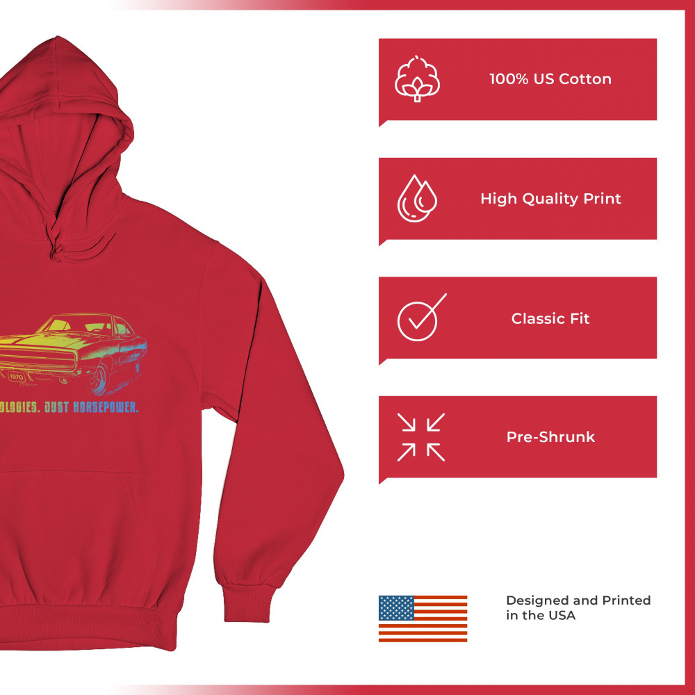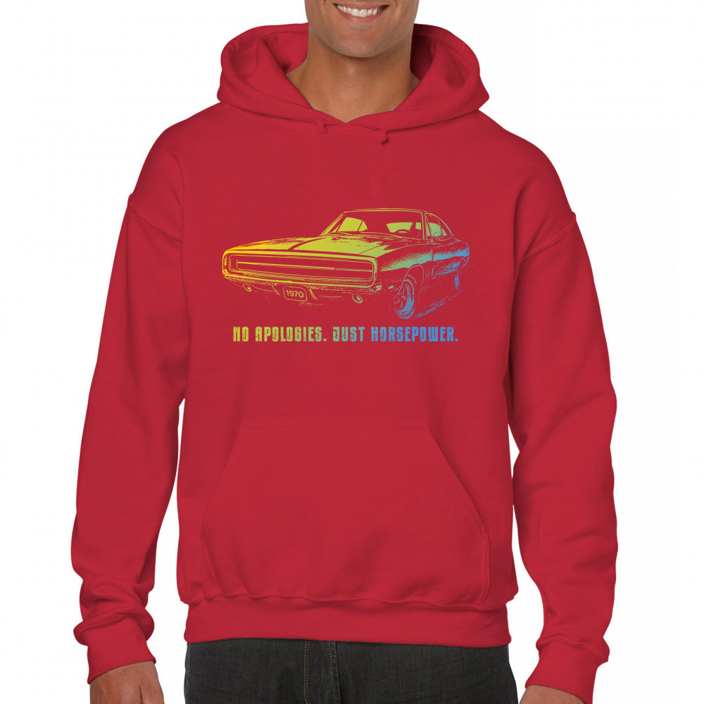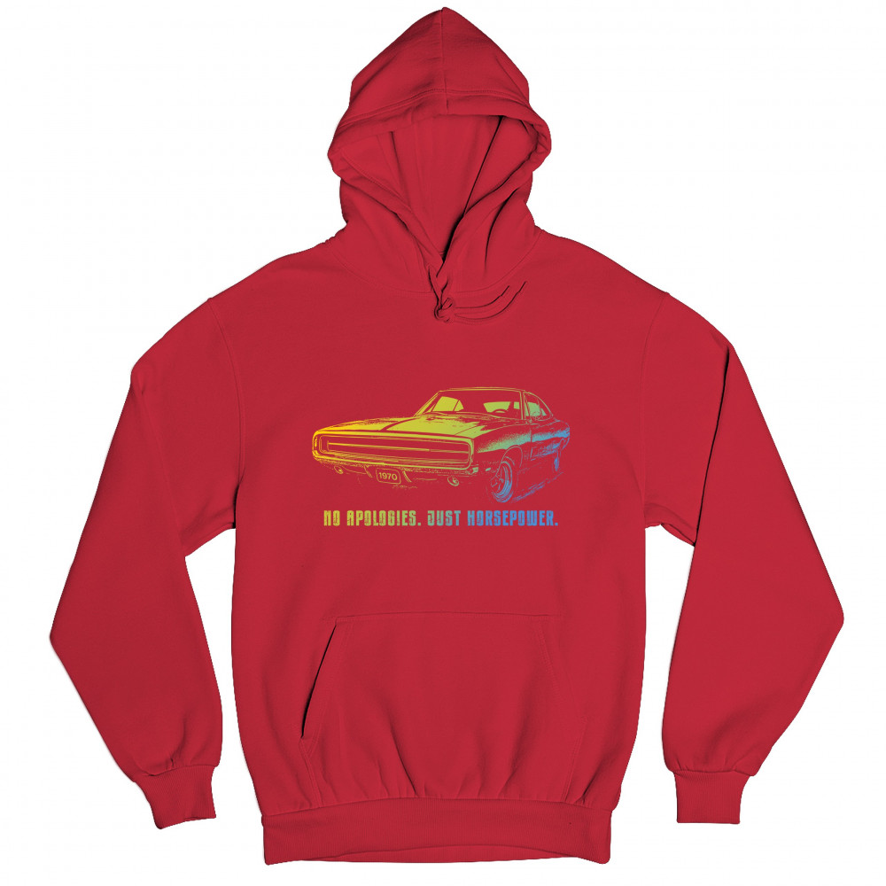 NO APOLOGIES JUST HORSEPOWER sweatshirt muscle car vintage 1970 power hoodie red