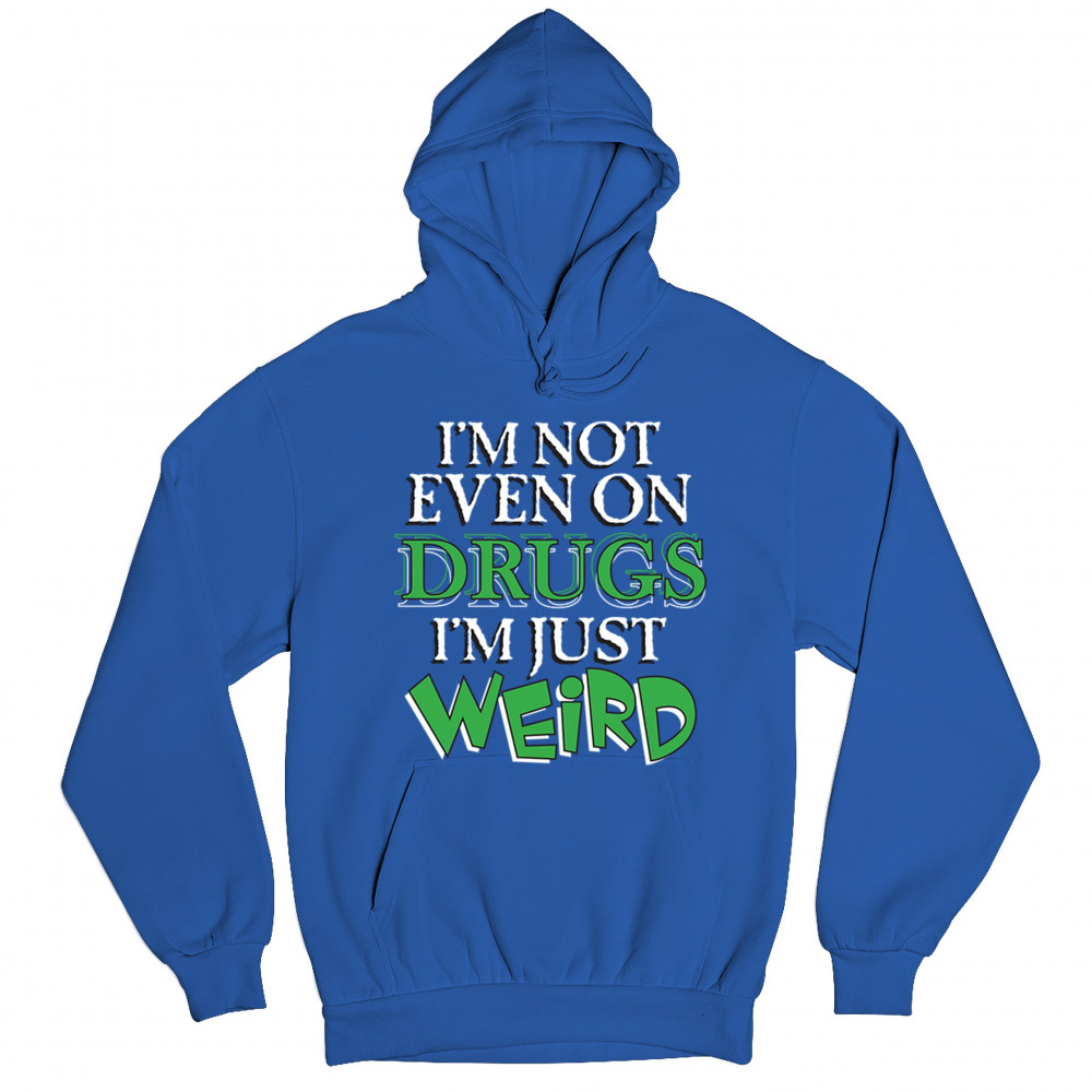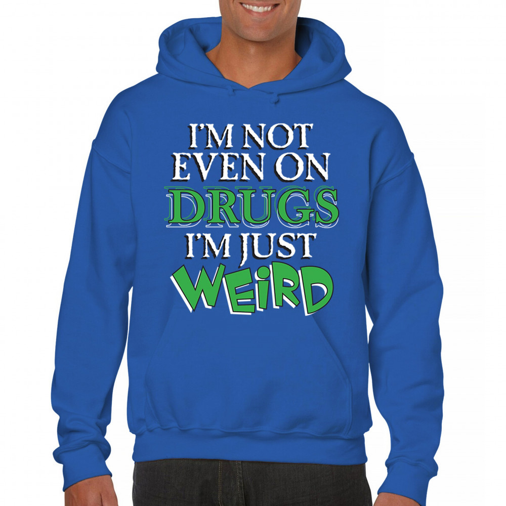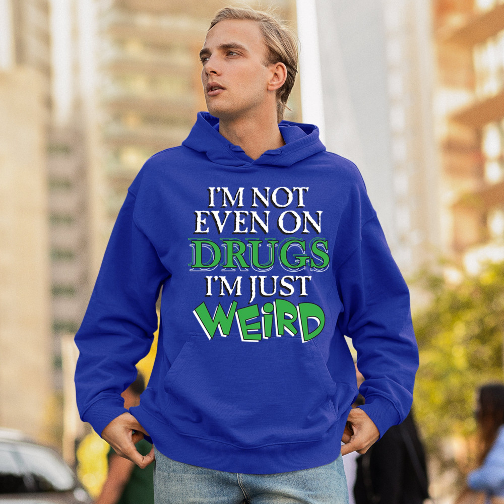 Bold weird design for introverts and quirky minds. Says “I'm not even on drugs I'm just weirdâ€â€”perfect for awkward humor and loud energy.