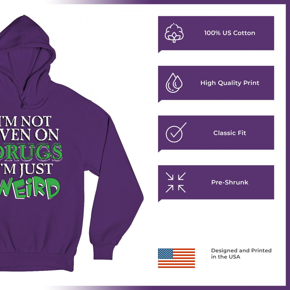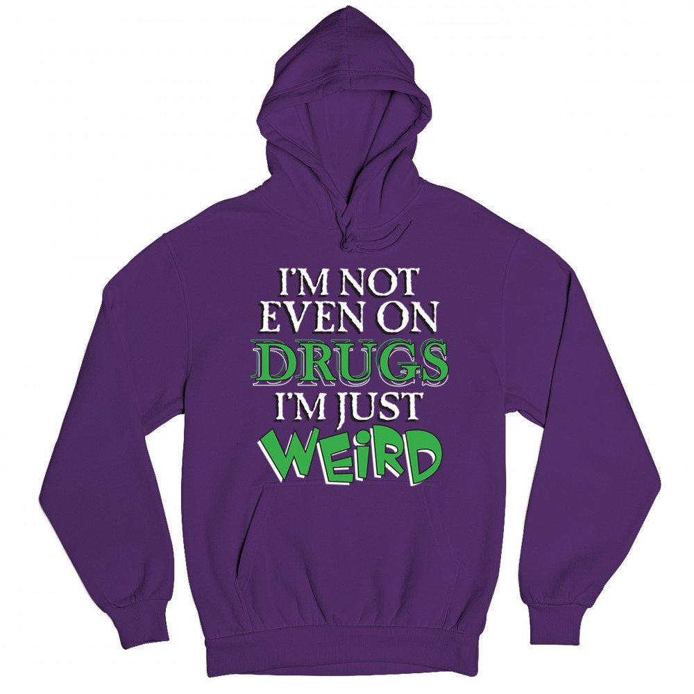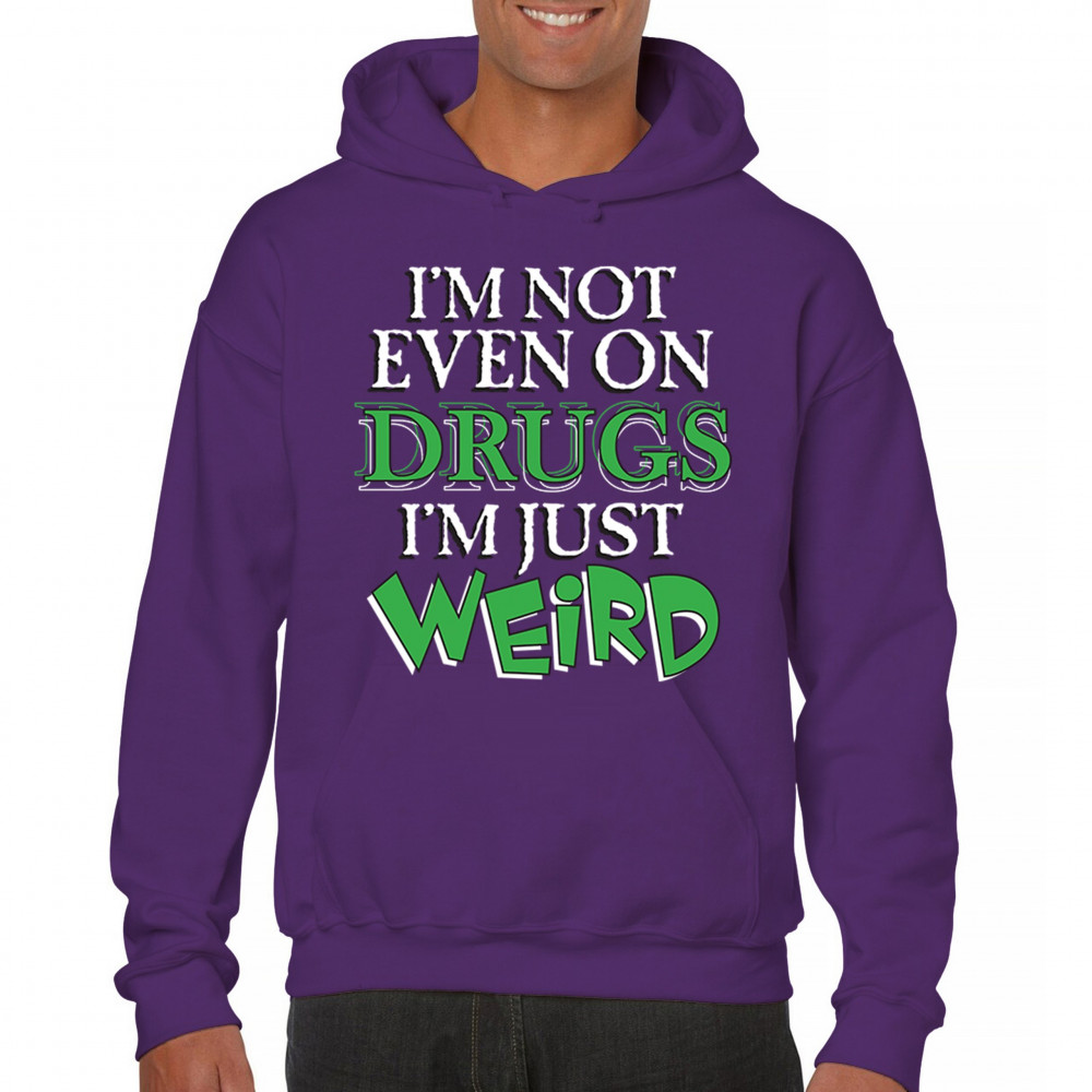 Bold weird design for introverts and quirky minds. Says “I'm not even on drugs I'm just weirdâ€â€”perfect for awkward humor and loud energy.
