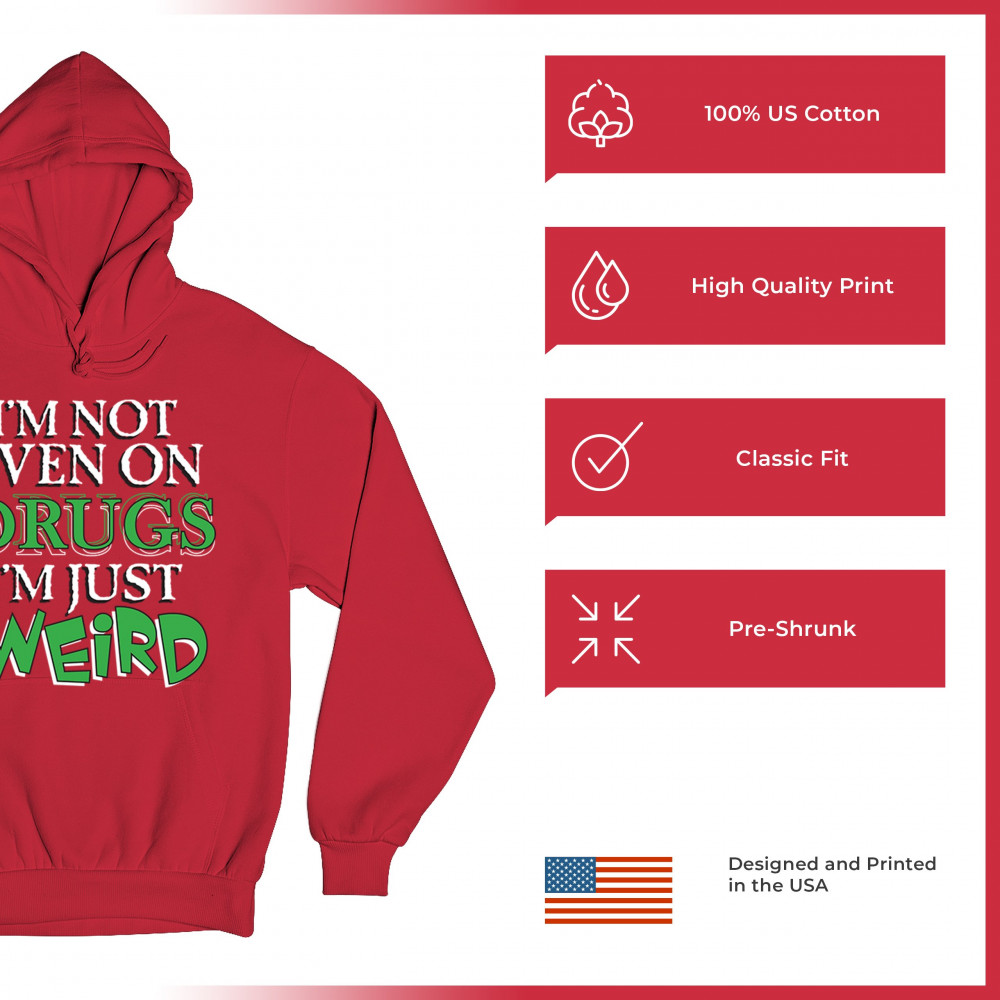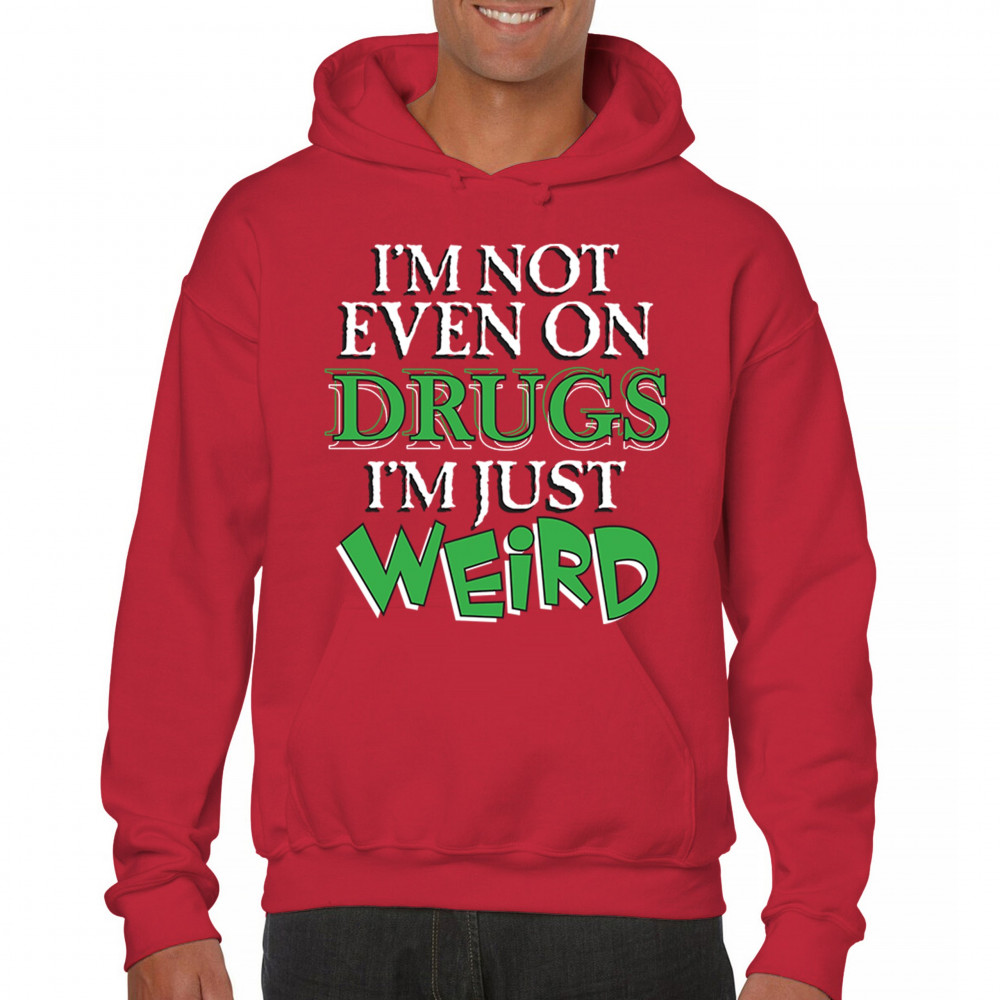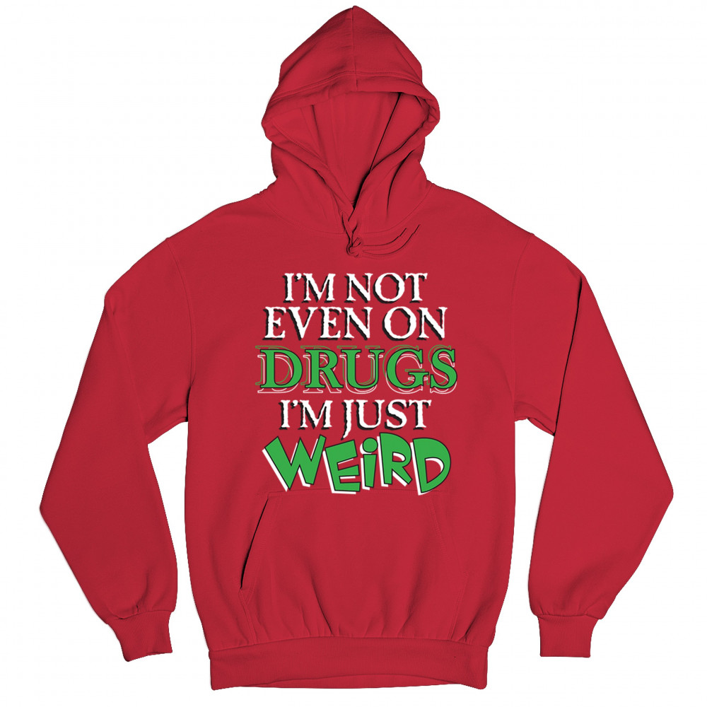 NOT EVEN ON DRUGS WEIRD sweatshirt funny antidrug humor sarcastic weed hoodie red
