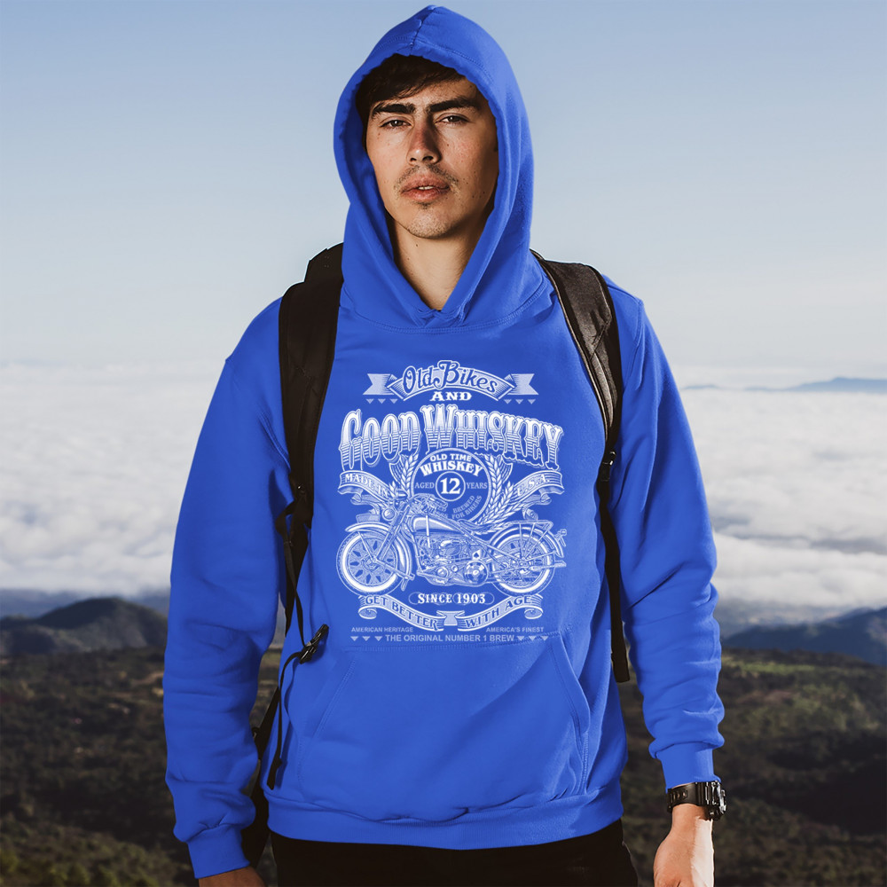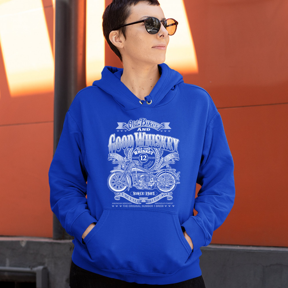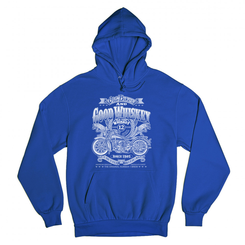 OLD BIKES AND GOOD WHISKEY sweatshirt route 66 motorcycle old school hoodie royal blue