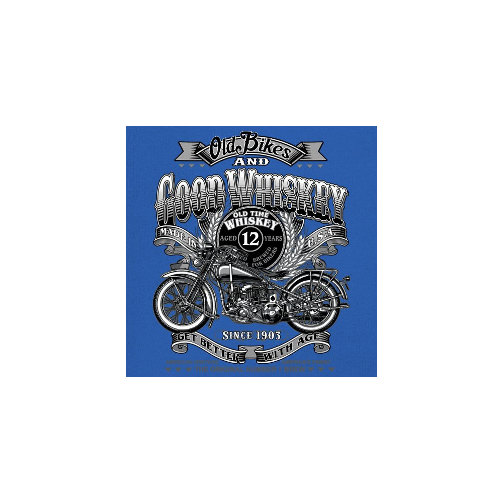 Vintage design with old bike, 12-year whiskey label, and 1903 tribute—perfect for bikers who ride hard and sip slow.