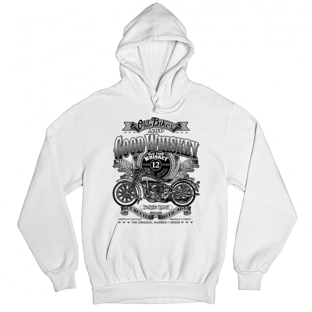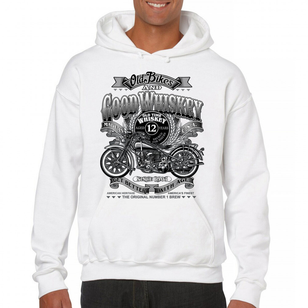 Vintage design with old bike, 12-year whiskey label, and 1903 tribute—perfect for bikers who ride hard and sip slow.