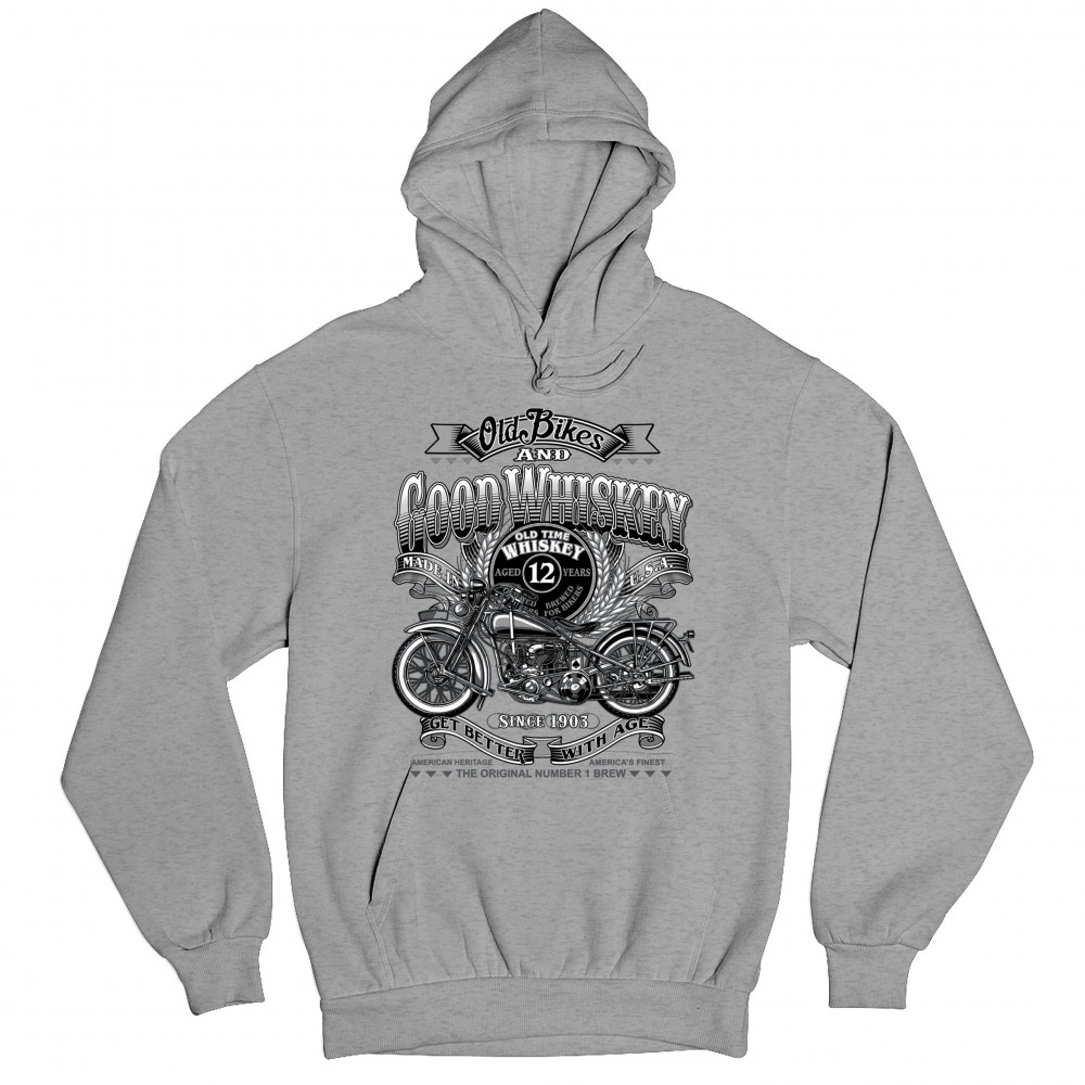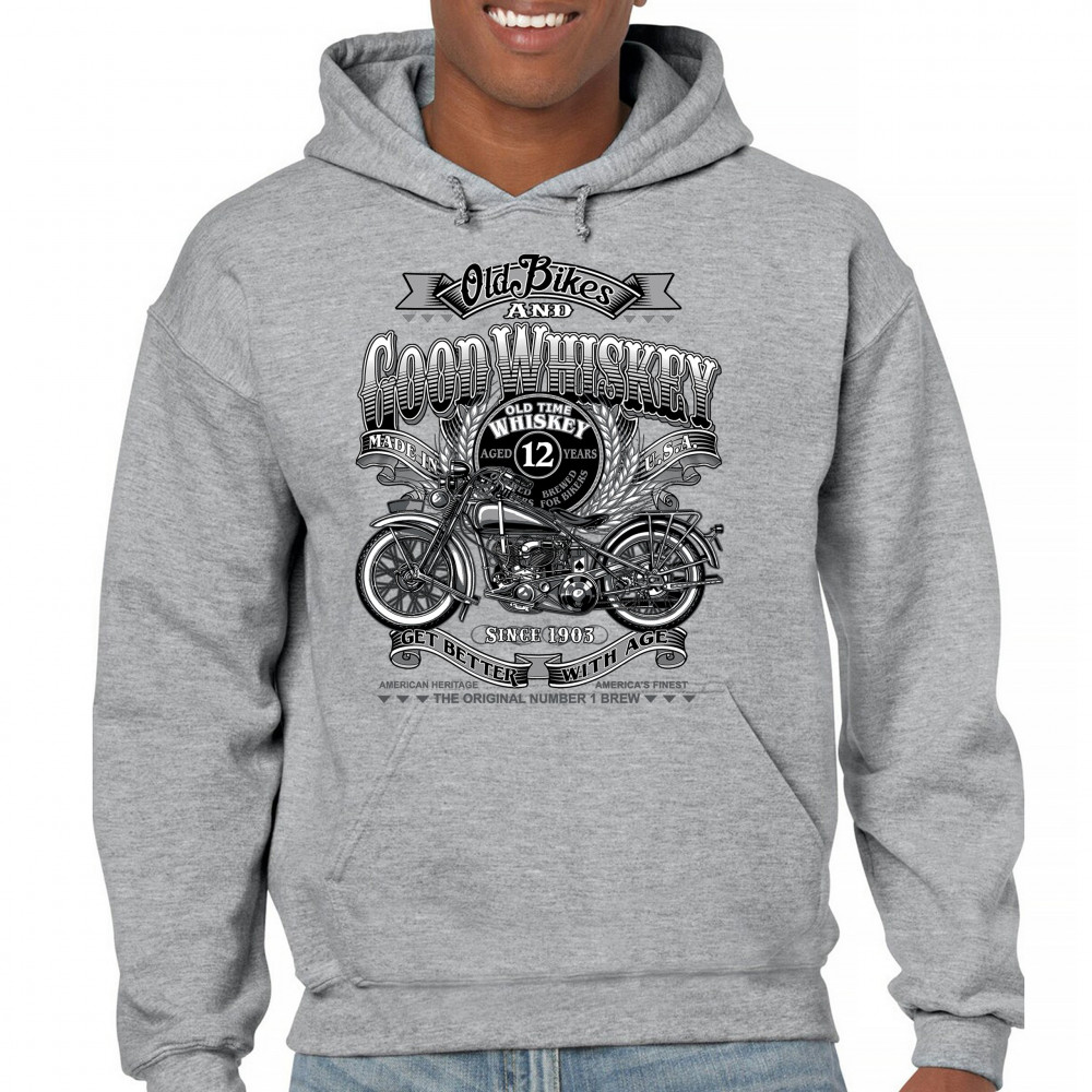 Vintage design with old bike, 12-year whiskey label, and 1903 tribute—perfect for bikers who ride hard and sip slow.