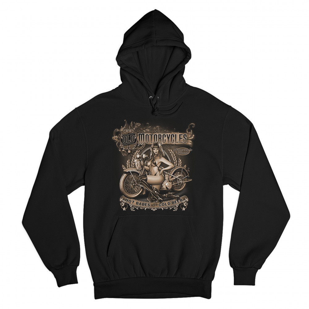 OLD MOTORCYCLES HOT BABES AND COLD BEER sweatshirt biker babe chopper hoodie black