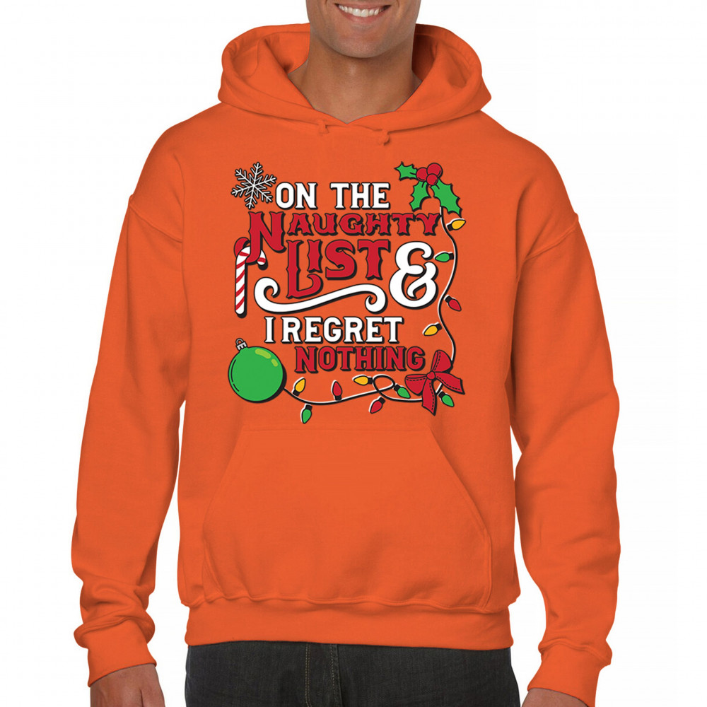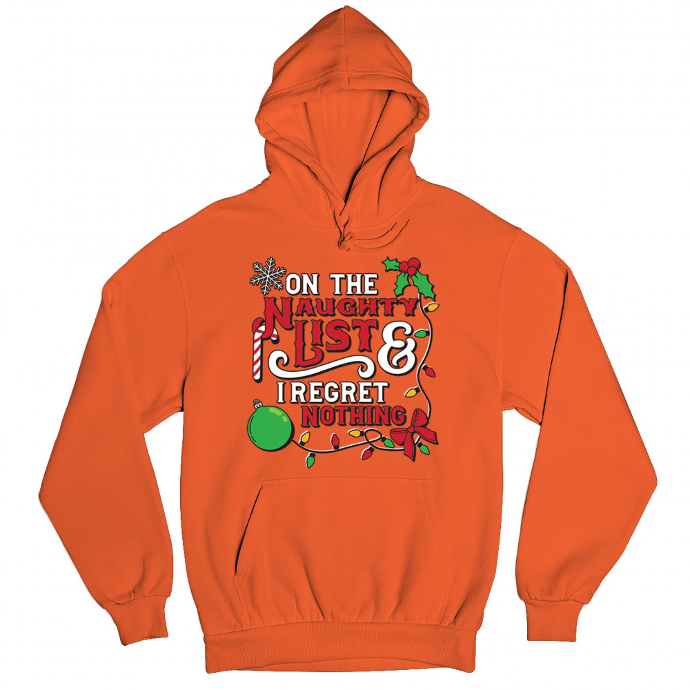 Express your holiday spirit with humor through the "Naughty List & I Regret Nothing" design, a perfect companion for Christmas celebrations, gift exchanges, or festive family gatherings. It adds a touch of playfulness to your winter wardrobe while spreading joy and laughter. Ideal for pairing with an ugly sweater or cozy holiday apparel, it’s the ultimate way to stay jolly and carefree throughout the season.