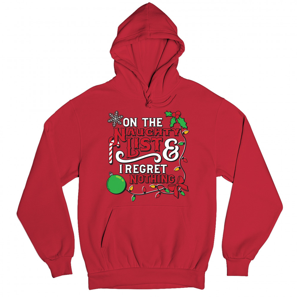 Express your holiday spirit with humor through the "Naughty List & I Regret Nothing" design, a perfect companion for Christmas celebrations, gift exchanges, or festive family gatherings. It adds a touch of playfulness to your winter wardrobe while spreading joy and laughter. Ideal for pairing with an ugly sweater or cozy holiday apparel, it’s the ultimate way to stay jolly and carefree throughout the season.