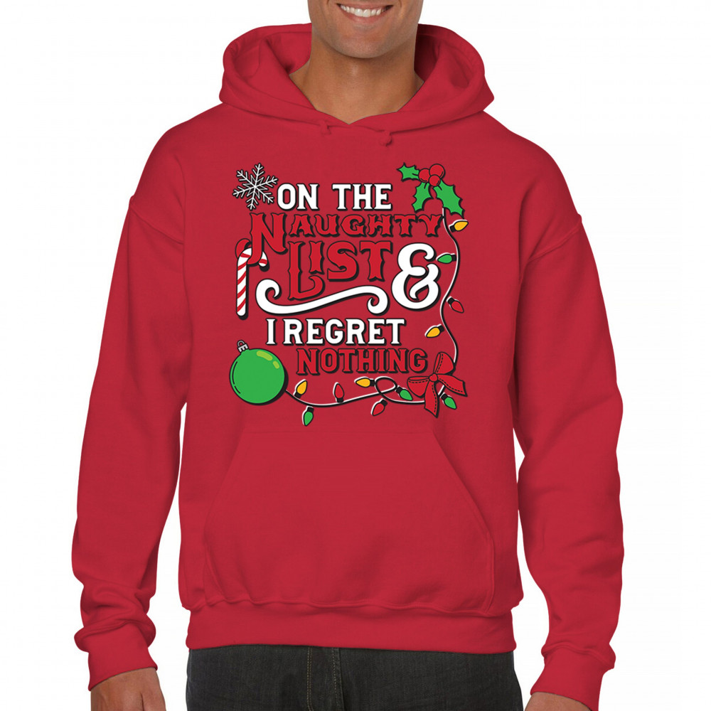 Celebrate the holidays with the playful “Naughty List & I Regret Nothing†design. Perfect for festive gatherings, ugly sweater parties, and holiday fun!
