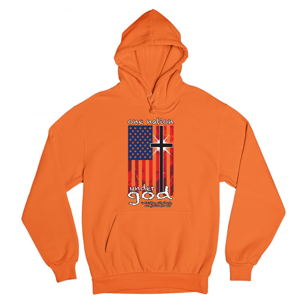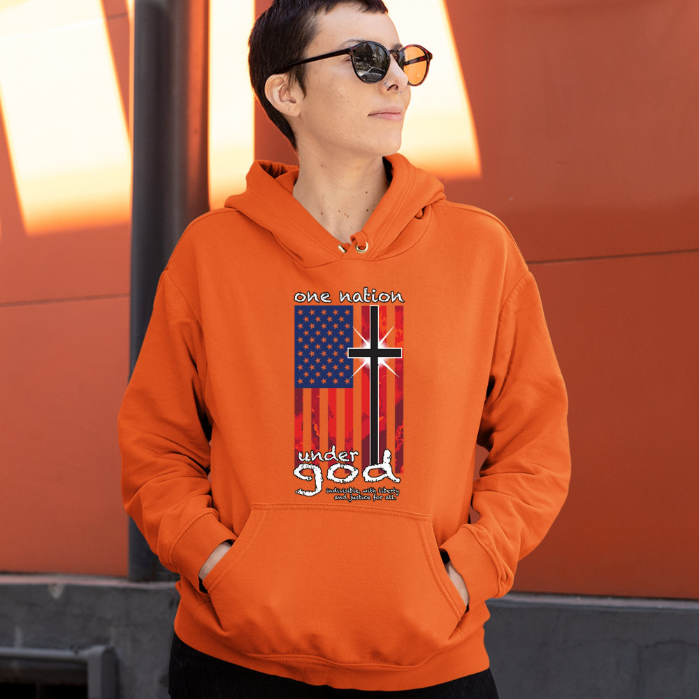 A patriotic print saying "One Nation Under God Indivisible, with Liberty and Justice for All" and featuring an American Flag with a cross instead of one of the stripes. Great choice for a religious person to wear on Independence Day or any other patriotic