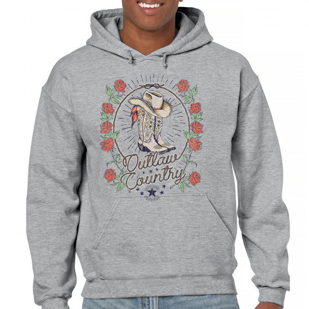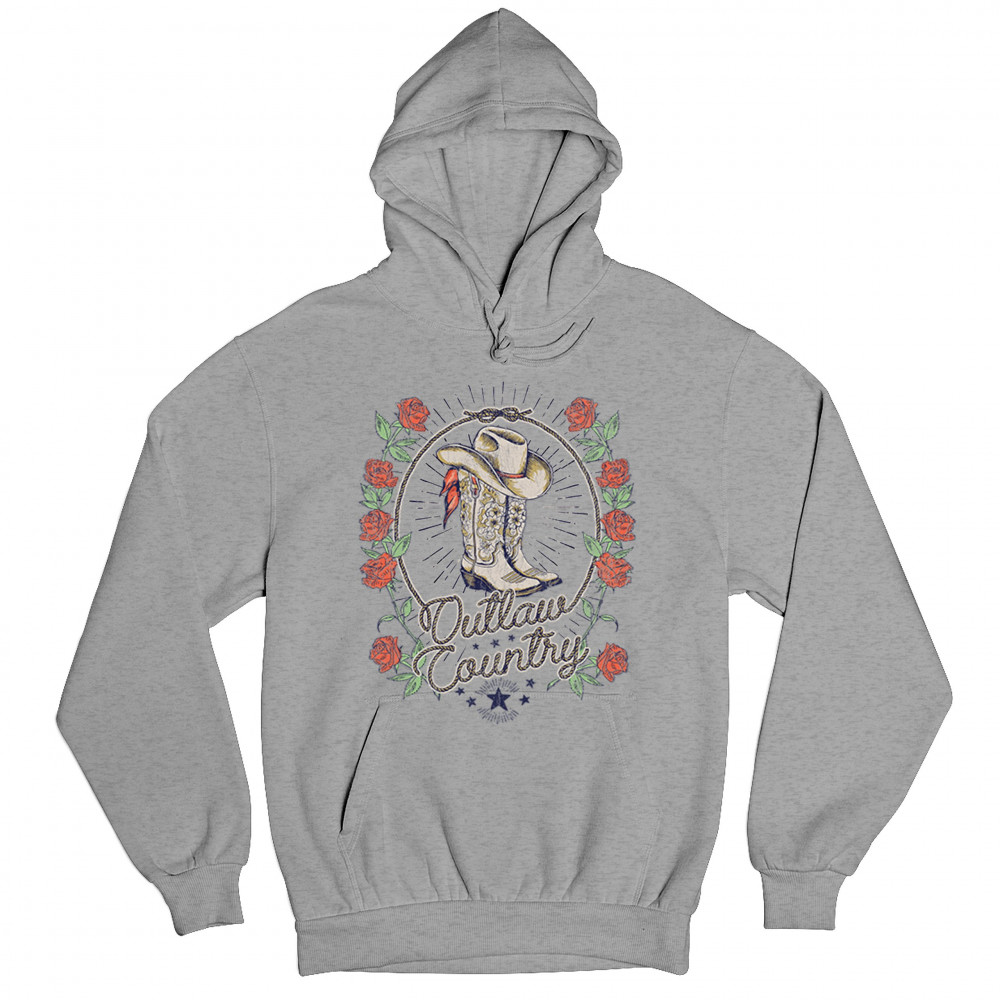 Outlaw country design with cowgirl boots, hat, and roses. Bold feminine western style for concerts, rodeos, and southern lifestyle lovers.