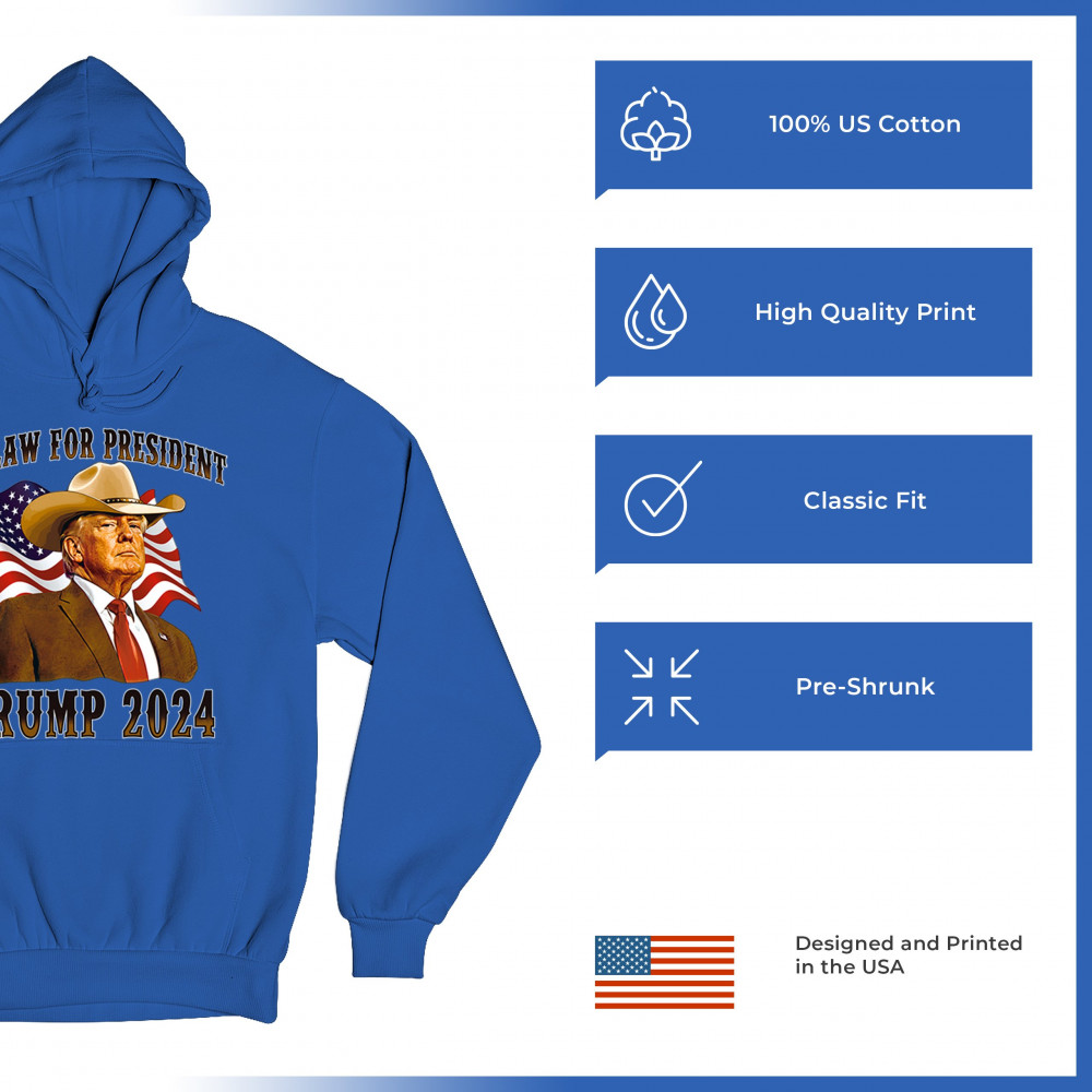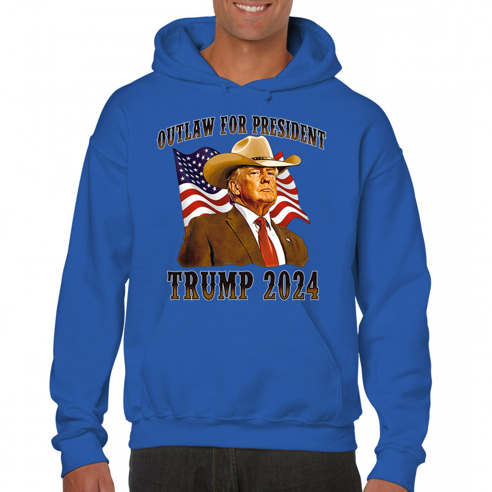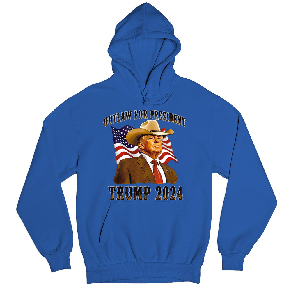 The "Outlaw for President" Trump 2024 design is a powerful symbol of American resilience and conservative pride. Featuring Donald J. Trump in a cowboy hat with the American flag waving behind, this design speaks to supporters who believe in the America First movement, conservative values, and a rebel spirit. Ideal for rallies, patriotic events, and anyone looking to make a bold statement for the 47th President of the United States.