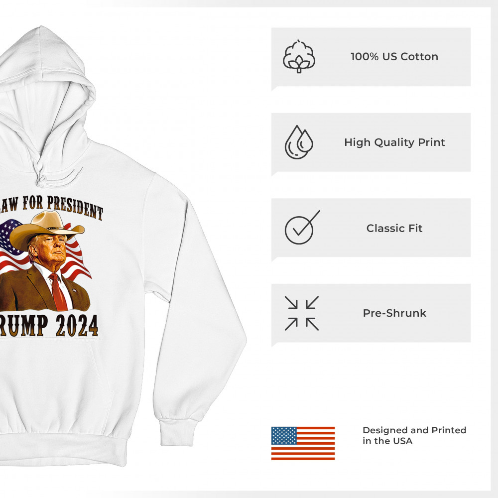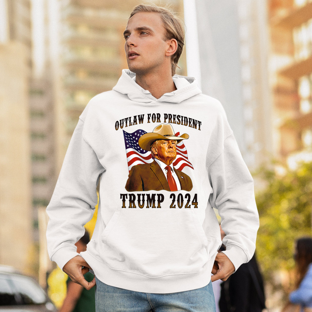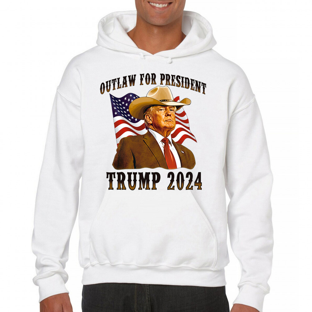 The "Outlaw for President" Trump 2024 design is a powerful symbol of American resilience and conservative pride. Featuring Donald J. Trump in a cowboy hat with the American flag waving behind, this design speaks to supporters who believe in the America First movement, conservative values, and a rebel spirit. Ideal for rallies, patriotic events, and anyone looking to make a bold statement for the 47th President of the United States.