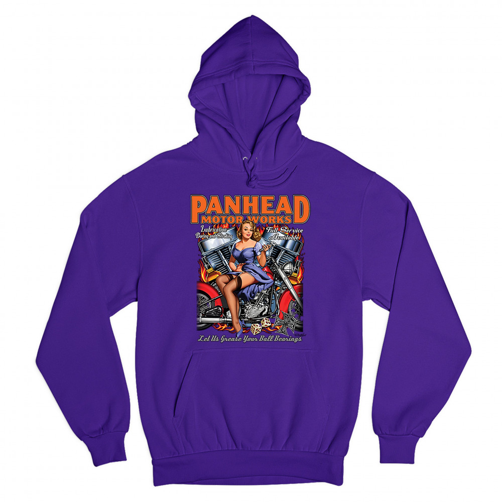 A print featuring a sexy pin-up girl sitting on a chopper motorcycle holding a wrench. In the background there is a V-engine. The print says: "Panhead motor works, Lubrication boring and stroking, Full service available, Let us grease your ball bearings".