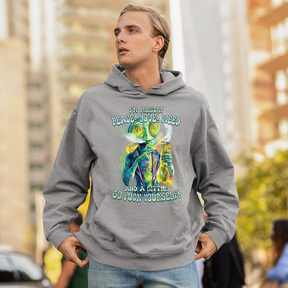 Bold alien cannabis design mixing humor, sarcasm, and weed culture—perfect for unapologetic smokers with attitude and peace vibes.