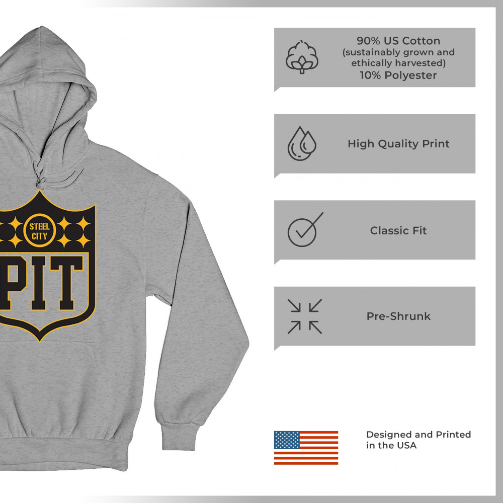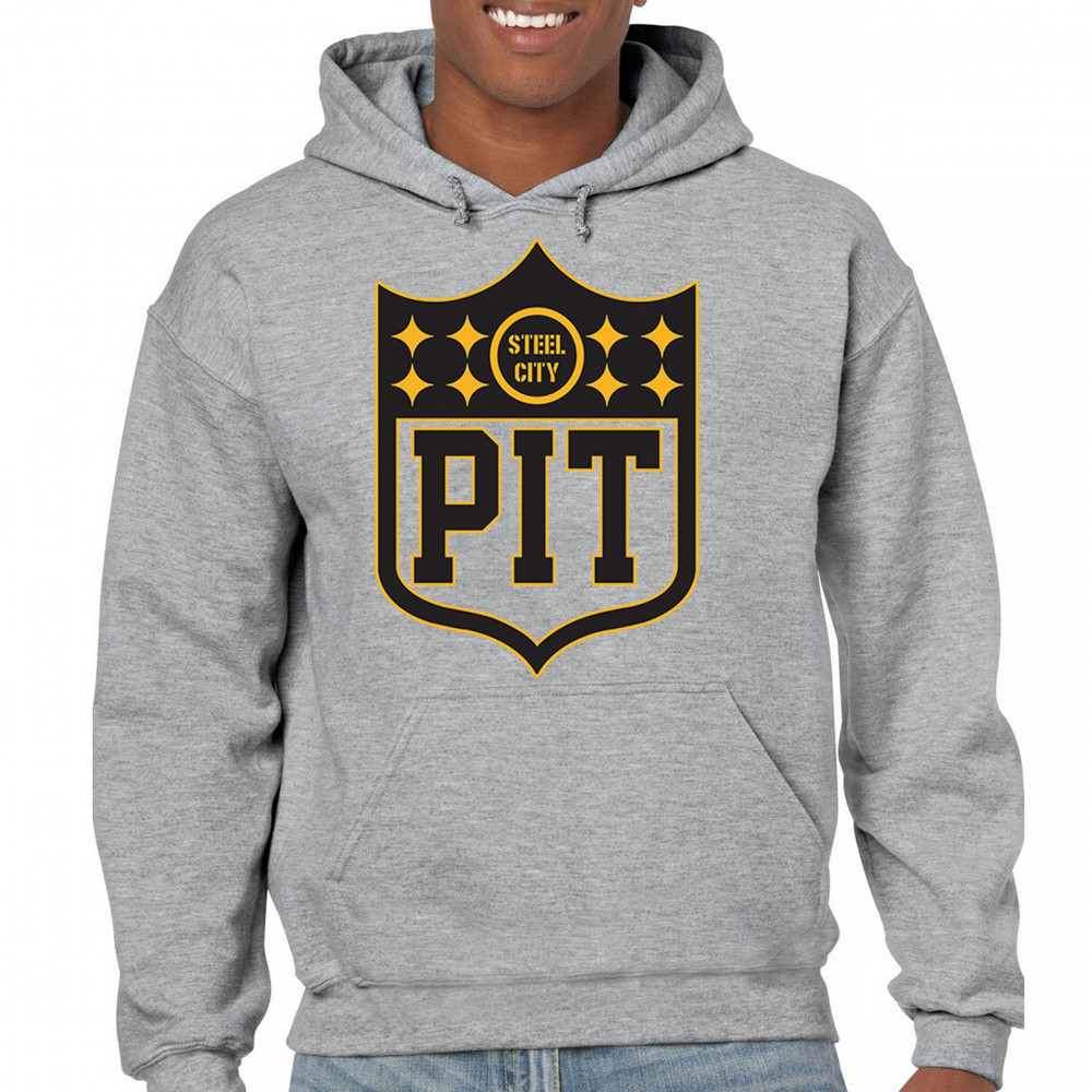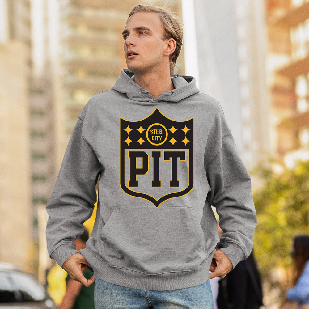 Steel City PIT shield football gear celebrating Pittsburgh football nation, gridiron tradition, playoff vibes, and sports heritage.