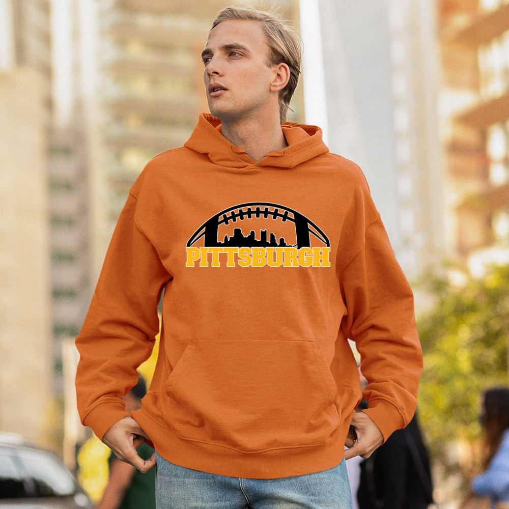 Embrace your Steel City pride with this bold Pittsburgh-themed design, showcasing the city skyline in a unique football graphic. Perfect for game day celebrations, tailgating parties, or everyday wear, this design captures the energy and passion of Pittsburgh's legendary sports culture. Whether you're cheering on your favorite team or representing your city, this design is a must-have for Pittsburgh fans.