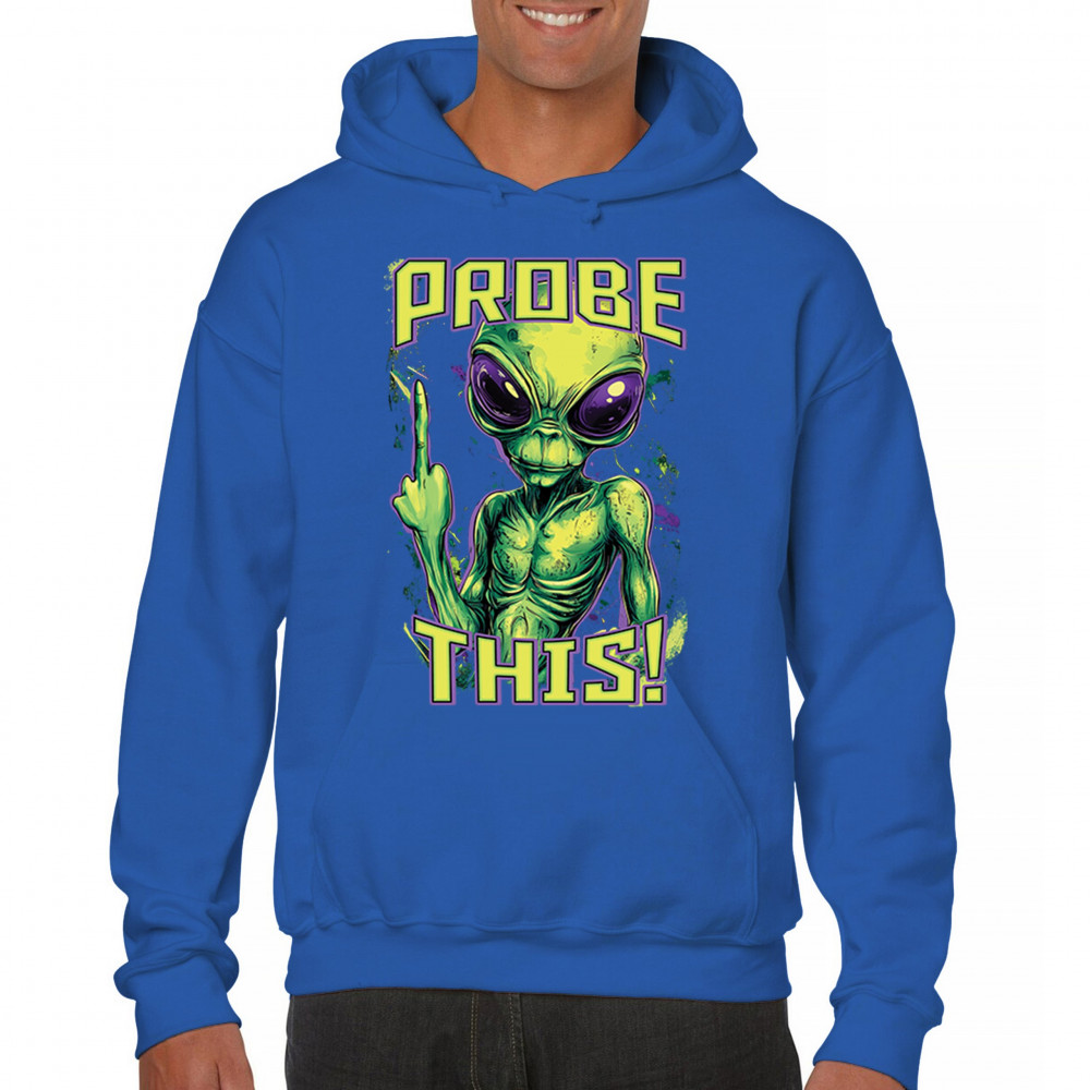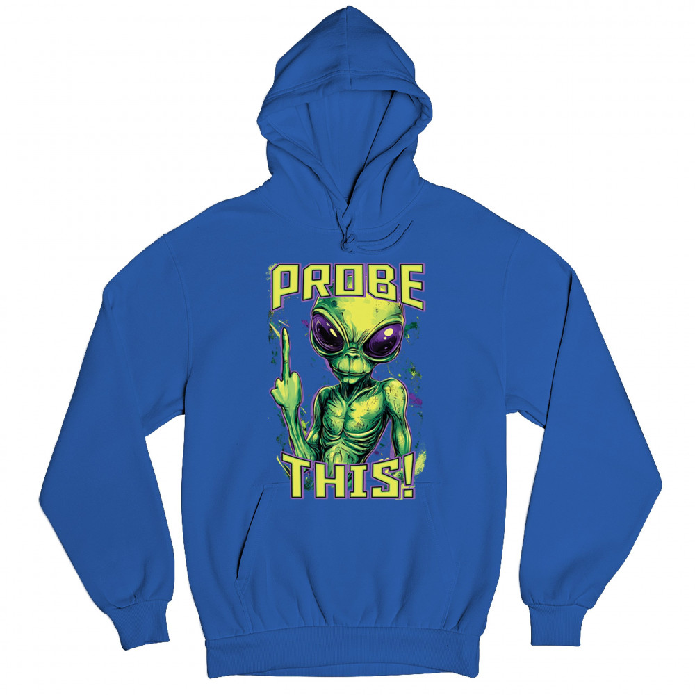 Alien attitude goes full throttle in this rebellious design featuring a defiant extraterrestrial flipping the bird. Bold green and purple tones amplify the sarcasm, making it perfect for UFO fans, protest vibes, and anyone with a dark sense of humor. Wear it loud to alien fests, parties, or anytime you want to stir the stars.