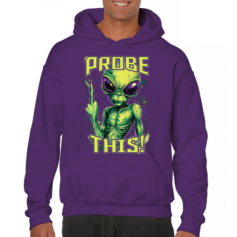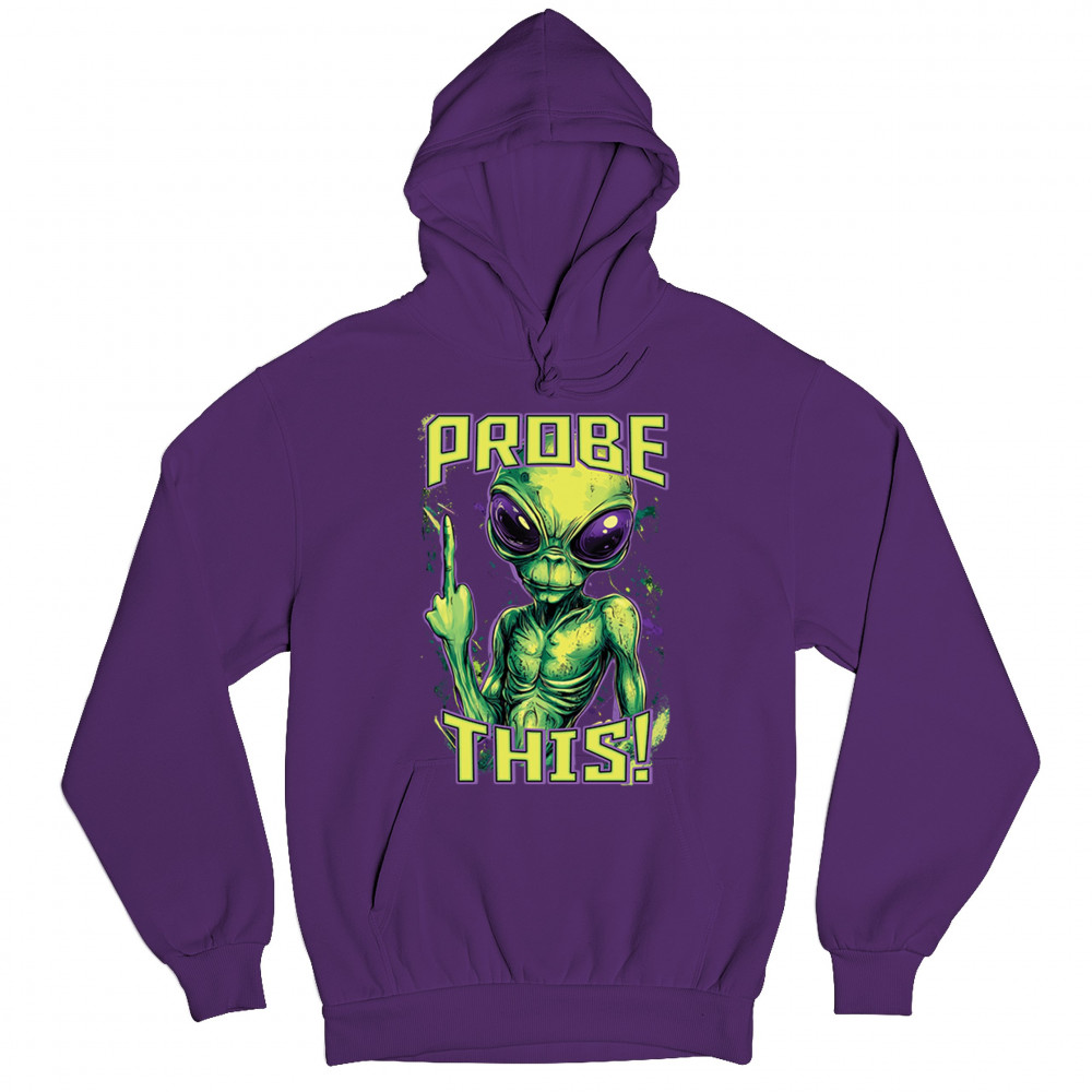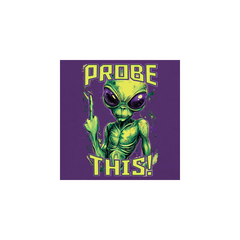 Alien attitude goes full throttle in this rebellious design featuring a defiant extraterrestrial flipping the bird. Bold green and purple tones amplify the sarcasm, making it perfect for UFO fans, protest vibes, and anyone with a dark sense of humor. Wear it loud to alien fests, parties, or anytime you want to stir the stars.