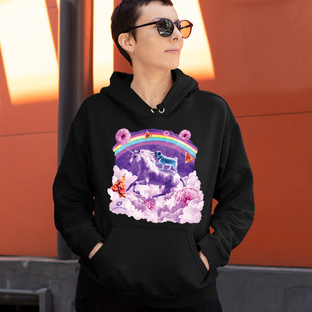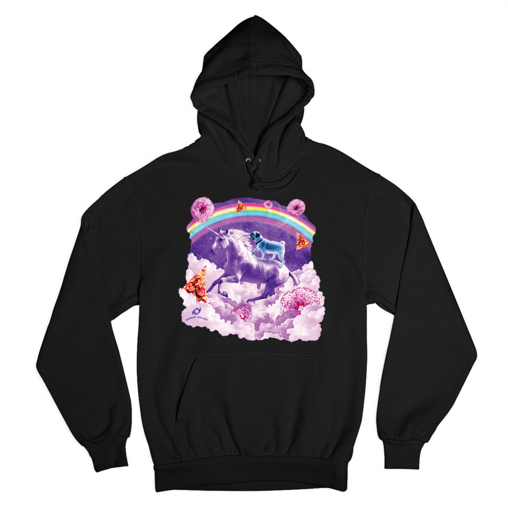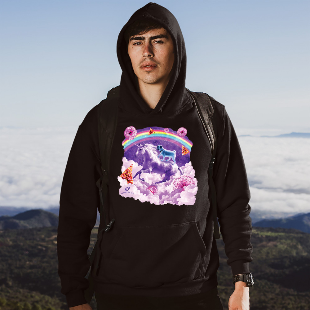A beautiful print featuring a pug standing on a back of a unicorn galloping through clouds. In the background a rainbow crossing the space is seen. Across the clouds numerous pizza slices and donuts are scattered. A great choice for a person who loves pug