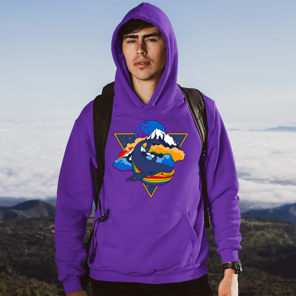 A print featuring a whale with a rainbow-colored belly. Behind it there are mountains in the clouds, an asteroid and a triangle frame through which space is seen. Great choice to wear as a proud queer person.