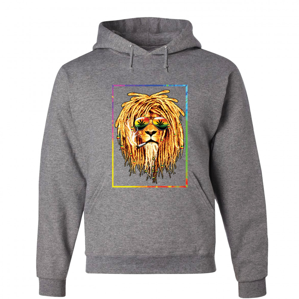 A print featuring a lion with dreadlocks smoking a joint and wearing sunglasses with marijuana leaves reflected in the them. The beads on the lion's dreadlocks and the glasses are painted with traditional Jamaican colors. Great choice for a pot aficionado