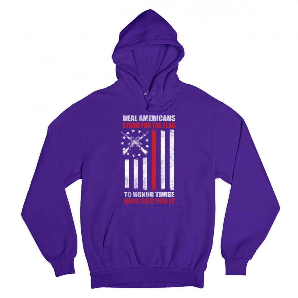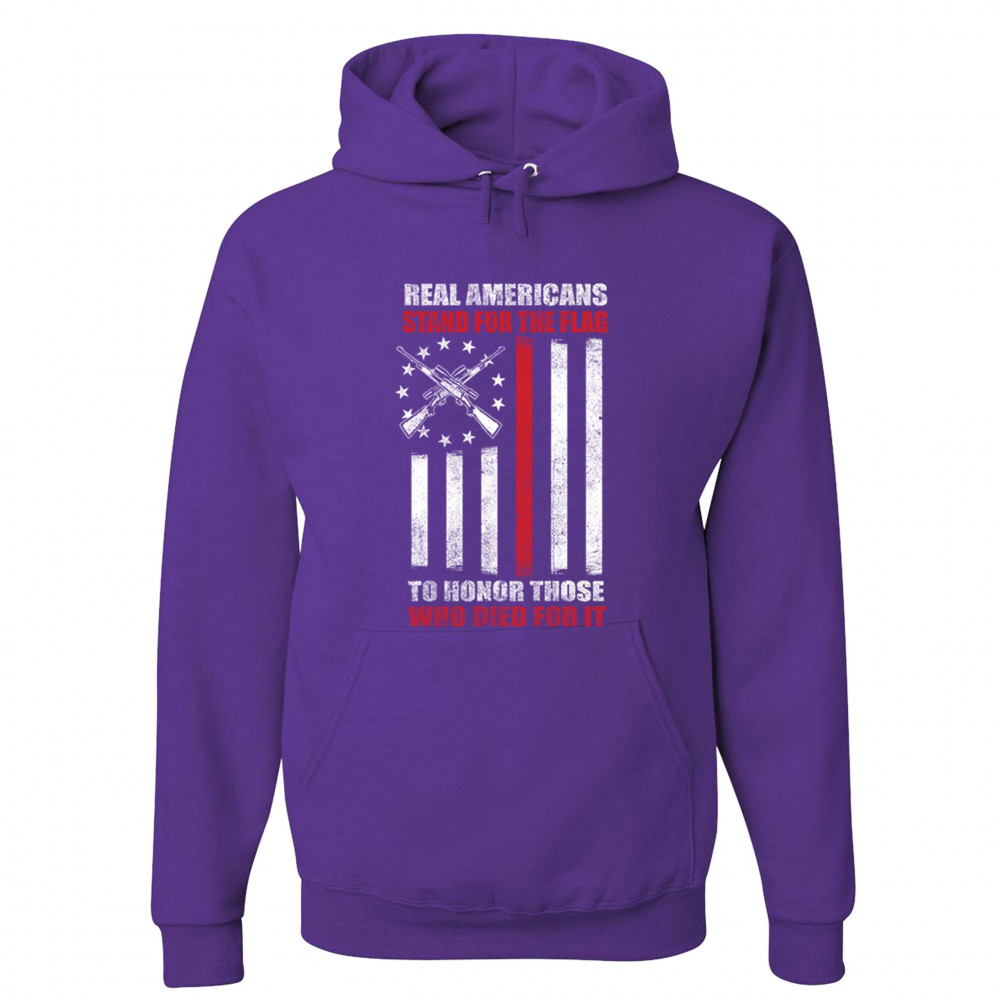 A patriotic print saying "Real Americans Stand for the Flag To Honor Those Who Died for It" and featuring a Betsy Ross American Flag with two crossed rifles inside the circle of stars and a thin red line insted of one of the stripes. Great choice to wear