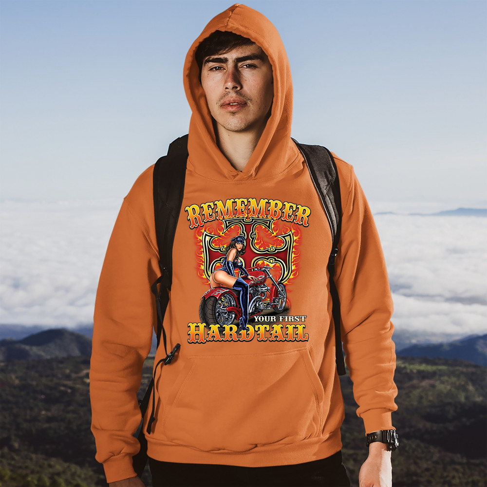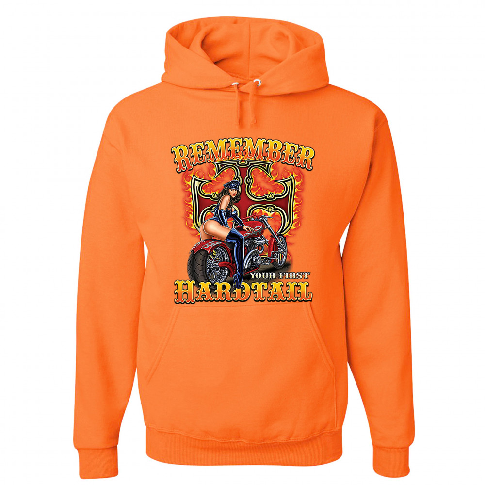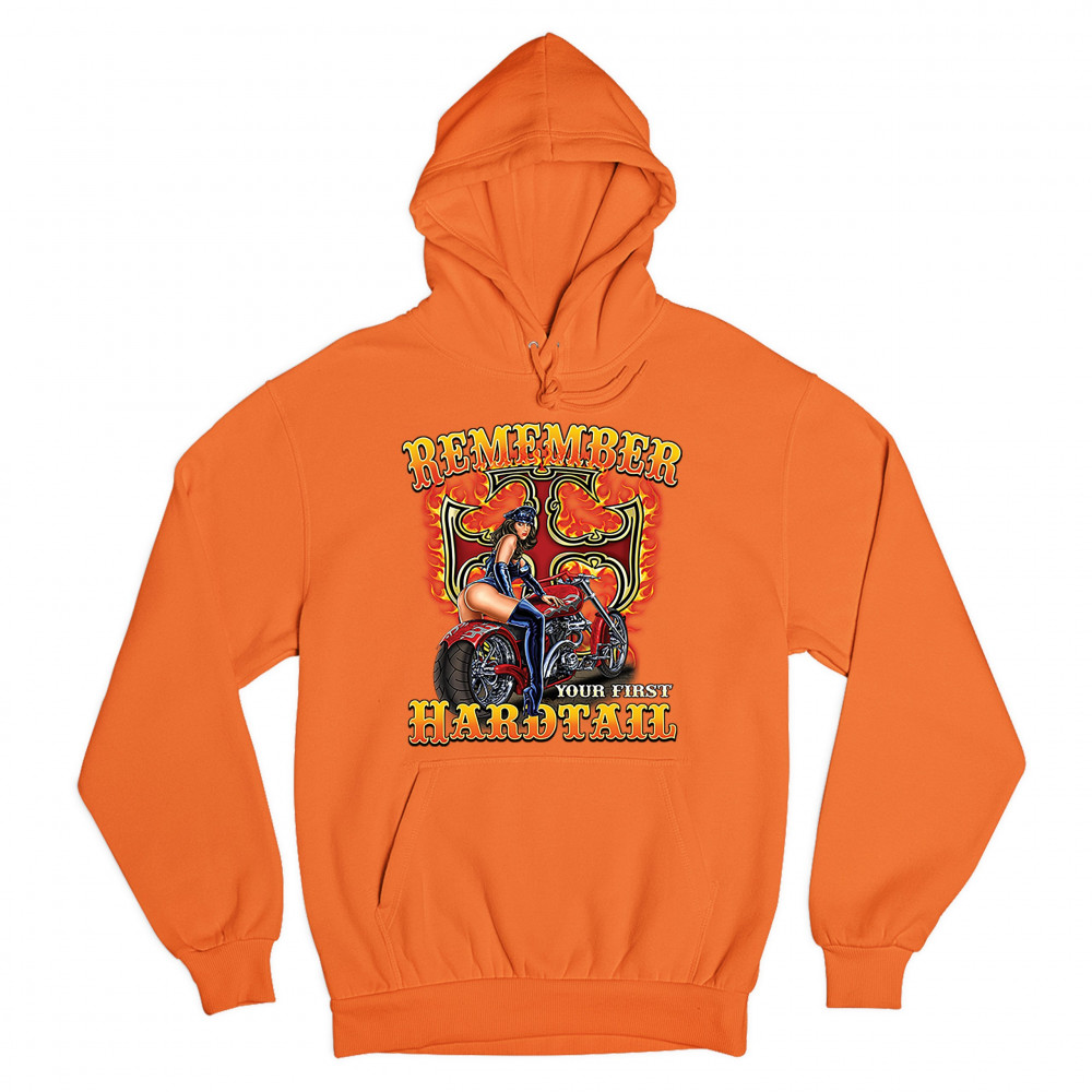 REMEMBER YOUR FIRST HARDTAIL sweatshirt biker babe motorcycle chopper hoodie orange