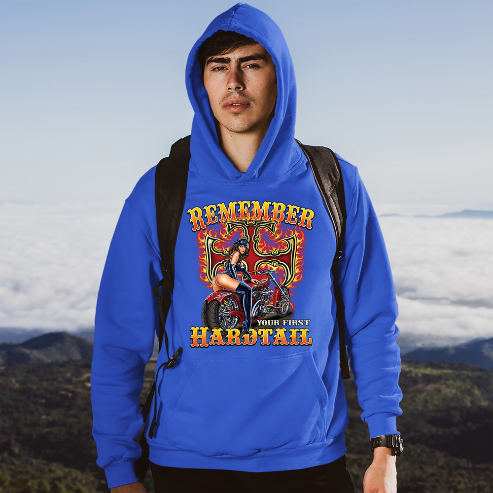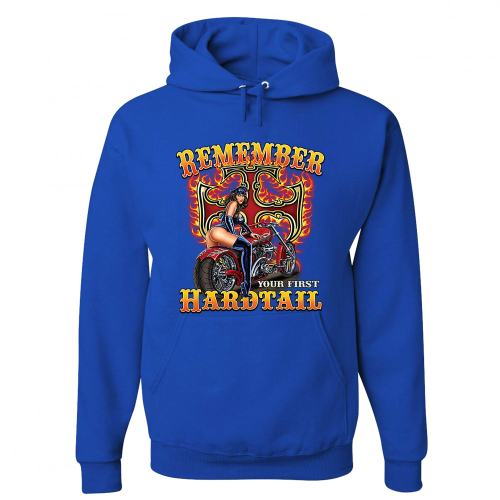 REMEMBER YOUR FIRST HARDTAIL sweatshirt biker babe motorcycle chopper hoodie royal blue