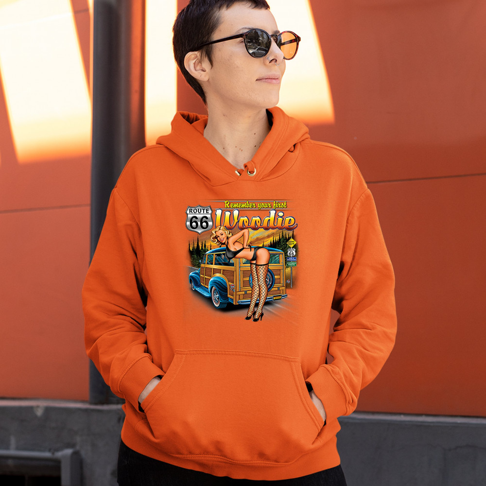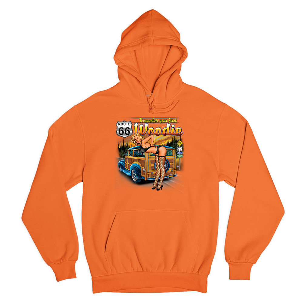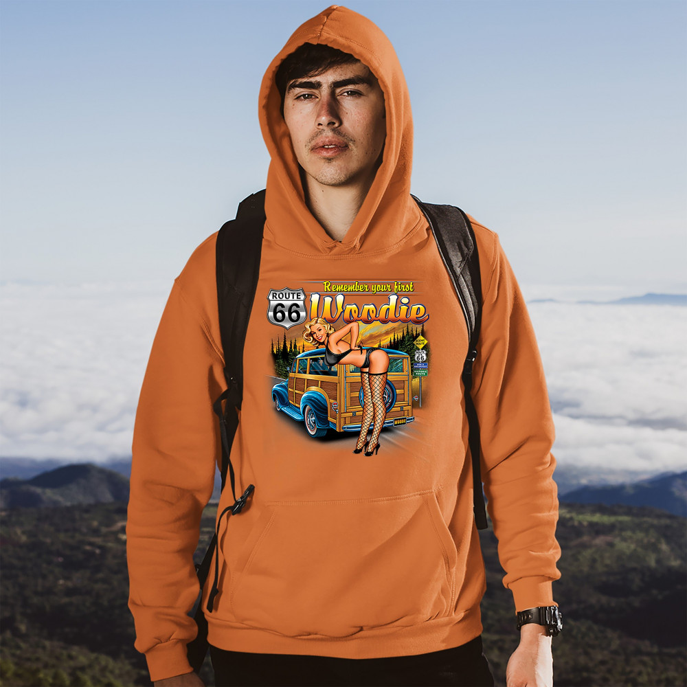 A print featuring a sexy blonde pin-up girl bending over and taking off her bra. Behind her there is a woodie wagon driving on a road. The print says: "Remeber your first woodie" and features a Route 66. A great choice for a fan of the legendary Mother Ro