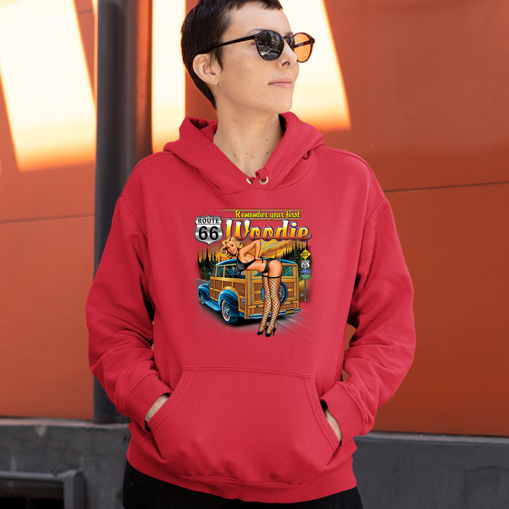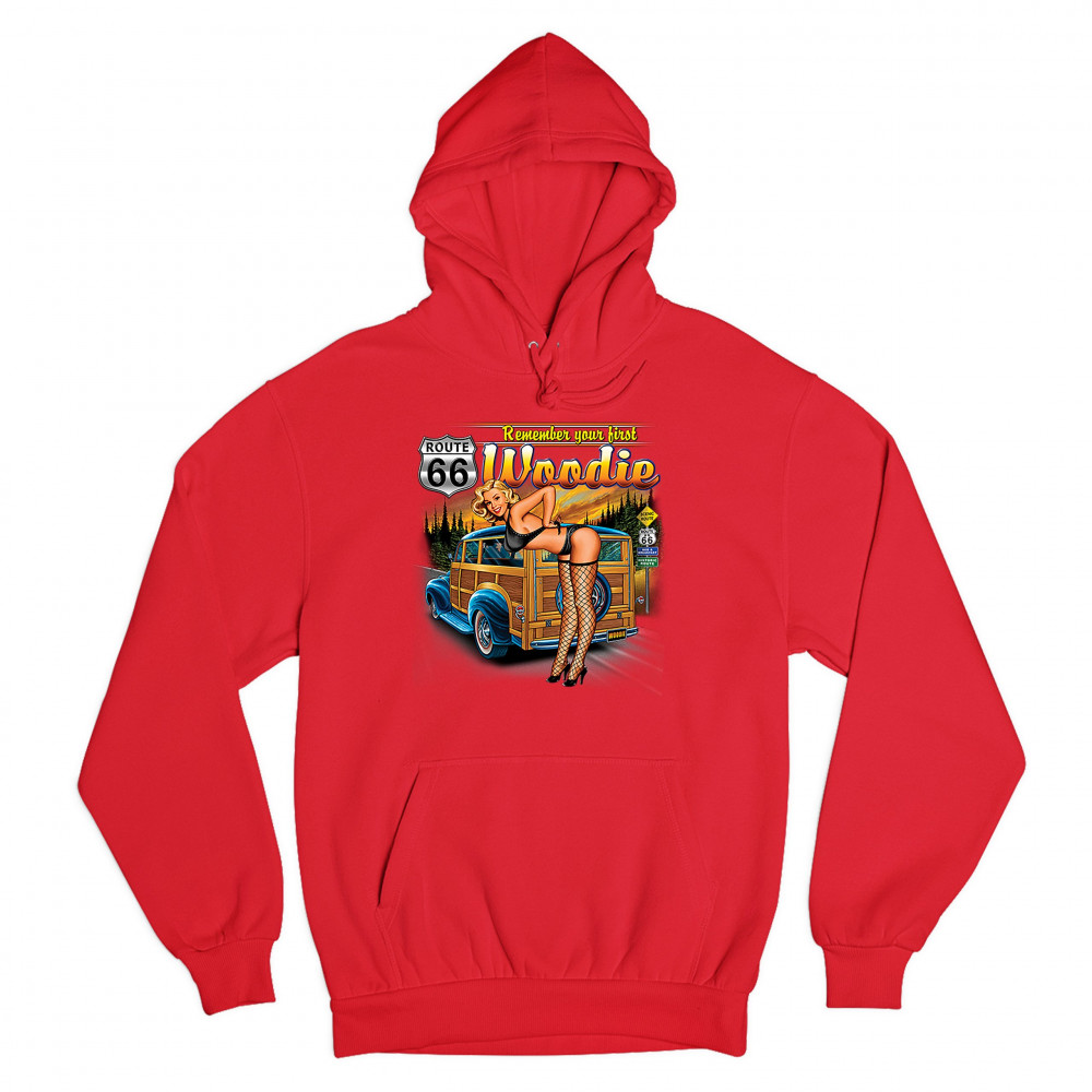 A print featuring a sexy blonde pin-up girl bending over and taking off her bra. Behind her there is a woodie wagon driving on a road. The print says: "Remeber your first woodie" and features a Route 66. A great choice for a fan of the legendary Mother Ro